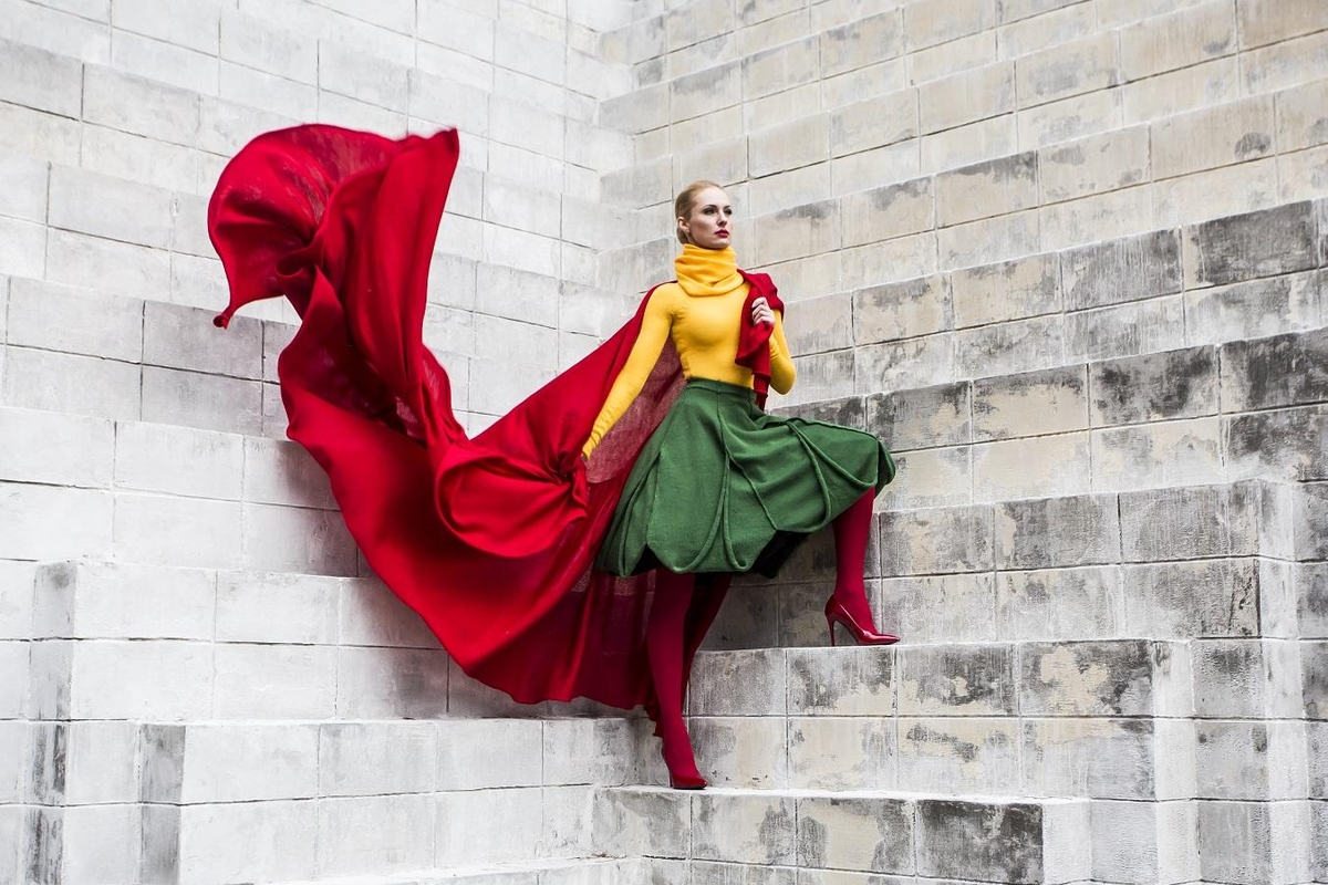 Trispalvę suknelę dizainerė mezgė tris savaites. Viršutinei suknelės daliai aukštu kaklu prireikė 400 metrų geltonos spalvos siūlų, žalios spalvos sijonui iki kelių – 1,6 kilometrų siūlų, o įspūdingai besiplaikstančiai didelei skraistei– 4,4 kilometrų raudonų siūlų.