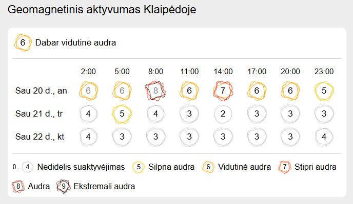 Trečiadienį, sausio 21 d., geomagnetinis aktyvumas jau bus mažesnis. Ankstyvą rytą, 5 val., vyraus silpna audra, vertinama 5 balais. Vėliau stebimas tik nedidelis suaktyvėjimas.