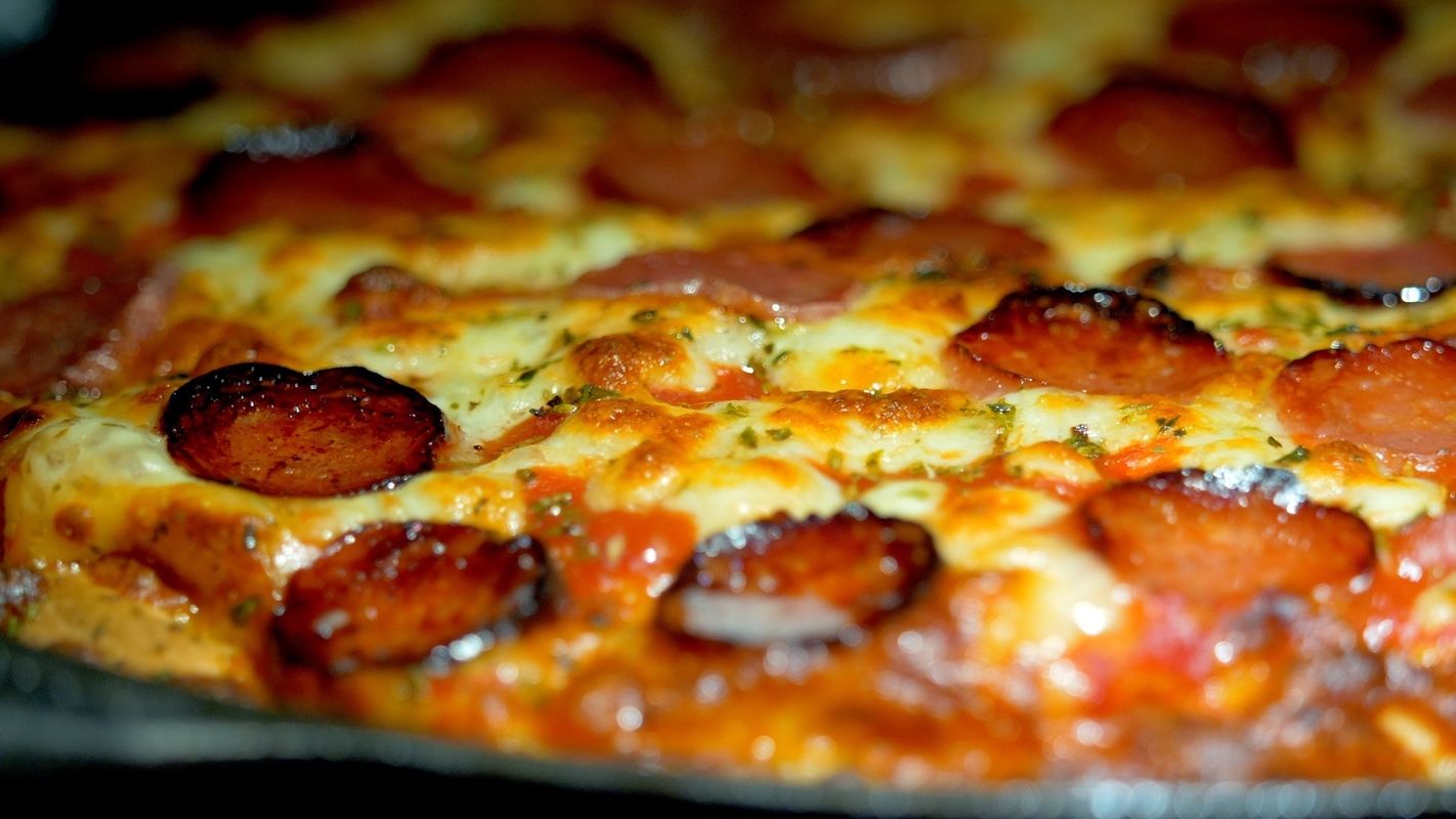 Į dubenį suberkite miltus, cukrų, žiupsnį druskos ir viską gerai išmaišykite. Sudėkite mieles, aliejų ir nedidele srovele, nuolat maišydami, supilkite vandenį. Užmaišykite tešlą. Nors ji bus lipni, maišykite tol, kol taps vientisa ir neliks gumuliukų. Į ketaus keptuvę įpilkite kelis šaukštus alyvuogių aliejaus ir gerai ją ištepkite. Tešlą sukrėskite į keptuvę, uždenkite aliejumi patepta maistine plėvele ir palikite maždaug valandai pastovėti šiltoje vietoje, kad pakiltų. Pakilusią tešlą apšlakstykite alyvuogių aliejumi ir spausdami pirštais paskirstykite po keptuvę, o tuomet palikite dar 15 min. pastovėti. Per tą laiką paruoškite likusius picos ingredientus. Picos padažui į dubenėlį įdėkite kelis šaukštus pjaustytų konservuotų pomidorų ir juos sumaišykite su keliais šaukštais pomidorų padažo. Ant picos pagrindo užberkite tarkuoto sūrio, šaukšteliu išdėliokite padažą, vėl pabarstykite sūrio ir sudėkite dešrą (naudokite šiek tiek storiau pjaustytą). Orkaitę įkaitinkite iki 230 °C temperatūros ir pašaukite į ją keptuvę su pica. Kepkite tol, kol pica iškils ir gražiai apskrus – apie 15–20 min.
