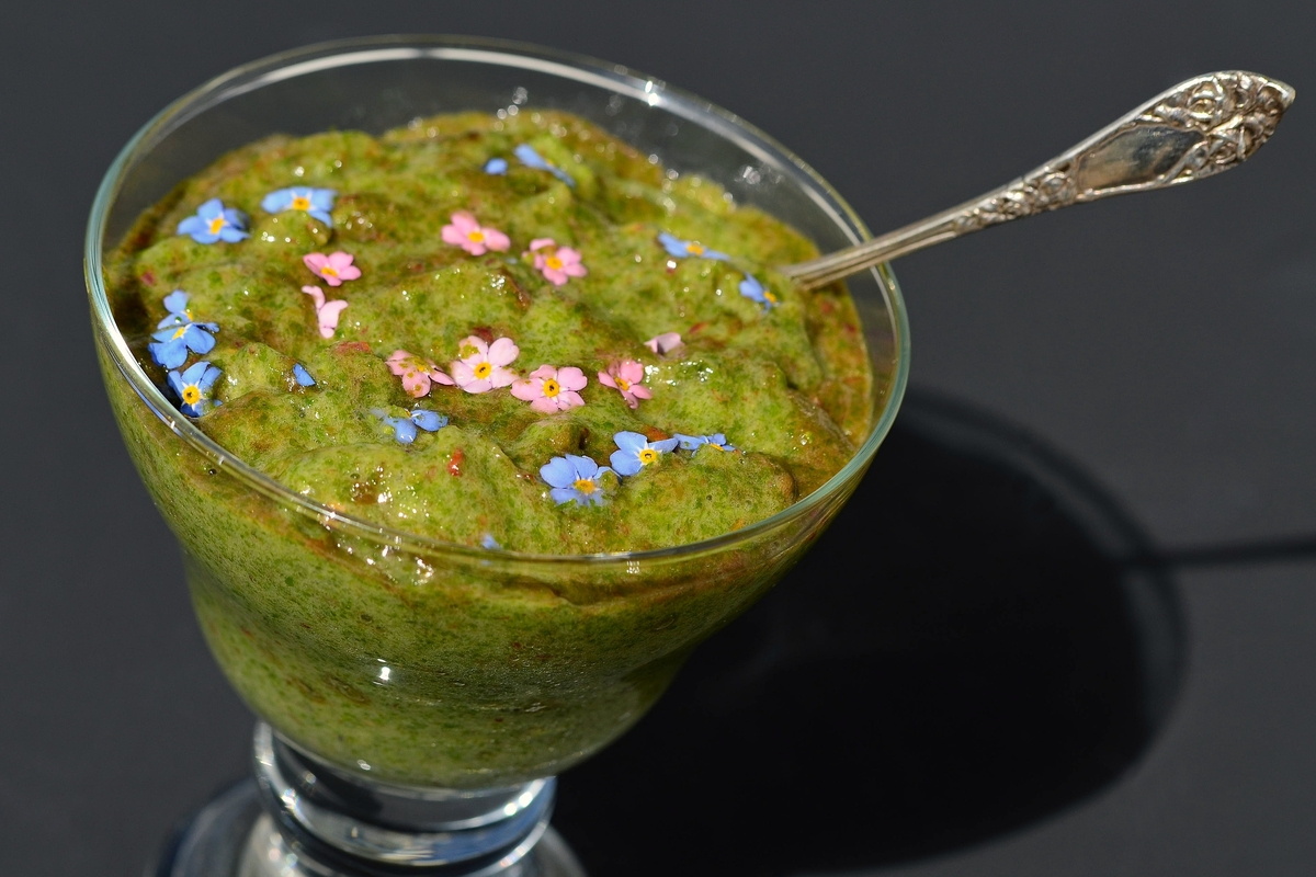 Į trintuvą, sulaužiusi stambiais gabalais, sudedu porą bananų. Beriu porą saujų dilgėlių arba saują dilgėlių ir saują garšvų. Arba dvi saujas garšvų – stengiuosi kiekvieną kartą daryti truputį kitaip. Pilu vandens tiek, kad apsemtų žoles. Jei norisi skystesnio kokteilio, vandens įpilkite daugiau. Sutrynusi iki vientisos masės, įberiu našlaičių ir suplėšytų kiaulpienių žiedų. Nieko ypatingo – įprastas žalias kokteilis. Papuoškite jį gėlyčių žiedais – bus ne tik gražu, bet ir labiau maistinga.