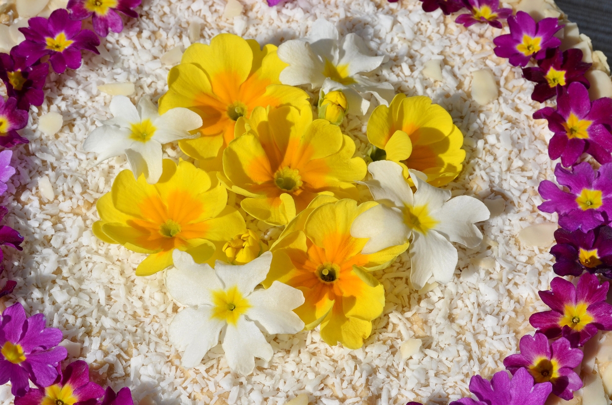 Sausainių tortas, puoštas raktažolėmis