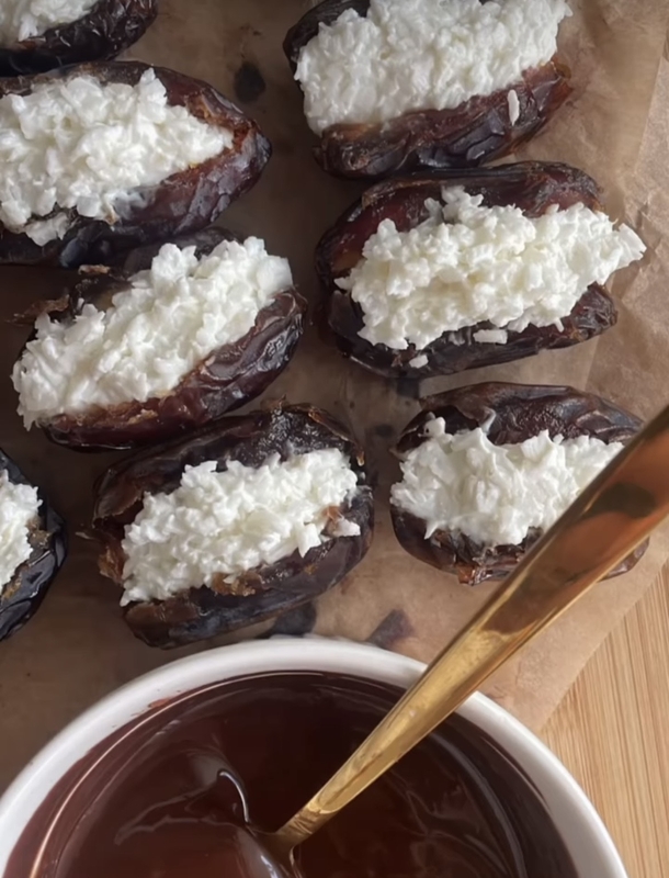 Datules perpjaukite išilgai, išimkite kauliukus. Sumaišykite kokosų drožles su graikišku jogurtu arba kokosų kremu (turi išeiti neskysta masė). Įdarykite datules. Apvoliokite išlydytame šokolade ir dėkite į šaldytuvą sustingti.