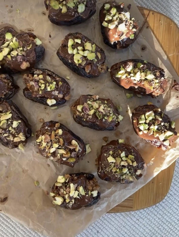 Datules perpjaukite išilgai, išimkite kauliukus. Susmulkinkite pekanines karijas sumaišykite su riešutų sviestu ar tahiniu. Mišiniu įdarykite datules. Apliekite jas lydytu šokoladu arba jame pamirkykite. Užberkite smulkintų pistacijų ir dėkite į šaldytuvą sustingti.
