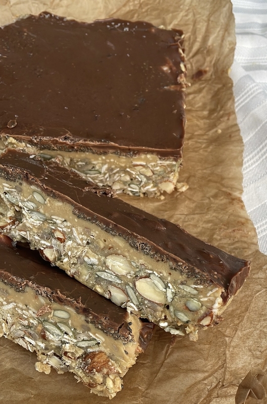 Žemės riešutų sviestą, medų ir vanilės ekstraktą sumaišykite iki vientisos masės. Tuomet suberkite sėklas ir viską labai gerai išmaišykite. Dėkite masę į formą ir stipriai suspauskite iš viršaus. Ant viršaus užtepkite 1/3 puodelio kreminio žemės riešutų sviesto (arba tahinio). Išlydykite šokoladą su kokosų aliejumi. Pilkite ant viršutinio sluoksnio (atsargiai, kad nesusimaišytų su apatiniu). Dėkite į šaldiklį valandai ar ilgiau, kad sustingtų. Išimkite, pjaustykite ir ragaukite. Šokoladukus reikia laikyti šaldiklyje.