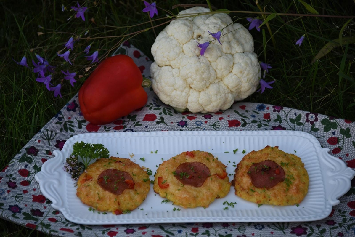 Kalafiorą nuplikykite verdančiu vandeniu, atvėsinkite ir susmulkinkite žiedinėliais. Paskui sutrinkite smulkintuvu iki labai smulkių gabalėlių. Susmulkinkite česnaką. Į kalafiorus įmaišykite kiaušinius, miltus, smulkintas česnako skilteles, raudonėlius ir bazilikus. Užminkykite tešlą. Skardą išklokite kepimo popieriumi, ant jo dėkite po šaukštą tešlos. Smulkiai supjaustykite papriką. Sutarkuokite sūrį. Ant kepsnelių berkite paprikos gabalėlius, tarkuotą sūrį ir ant viršaus uždėkite po saliamio griežinėlį. Kepkite iki 190 laipsnių įkaitintoje orkaitėje, kol kepsneliai pradės rusvėti. Patiekite su daržovių salotomis.