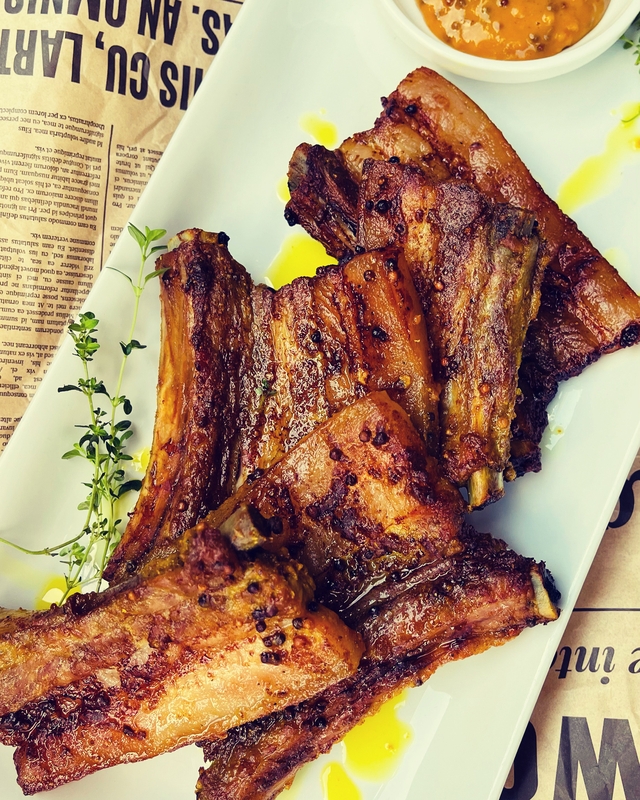 Kiaulieną supjaustykite 1 cm storio riekelėmis. Jas ištrinkite druska, pipirais ir kariu, aptepkite garstyčiomis ir aliejumi. Taip marinuojamą mėsą galima laikyti šaldytuve dvi paras. Mėsą kepkite keptuvėje tol, kol išsilydys didžioji dalis riebalų. Jei neturite laiko ir noro stovėti prie viryklės, sudėkite viską į kepimo skardą, kepkite pusę valandos iki 160 °C įkaitintoje orkaitėje, po to dar 30 minučių – 180 °C orkaitėje. (Man net labiau patiko orkaitėje, mėsa buvo sultingesnė ir minkštesnė.) Patiekti su daržovėmis, pomidorų padažu, krienais, garstyčiomis ar kitu mėgstamu garnyru.