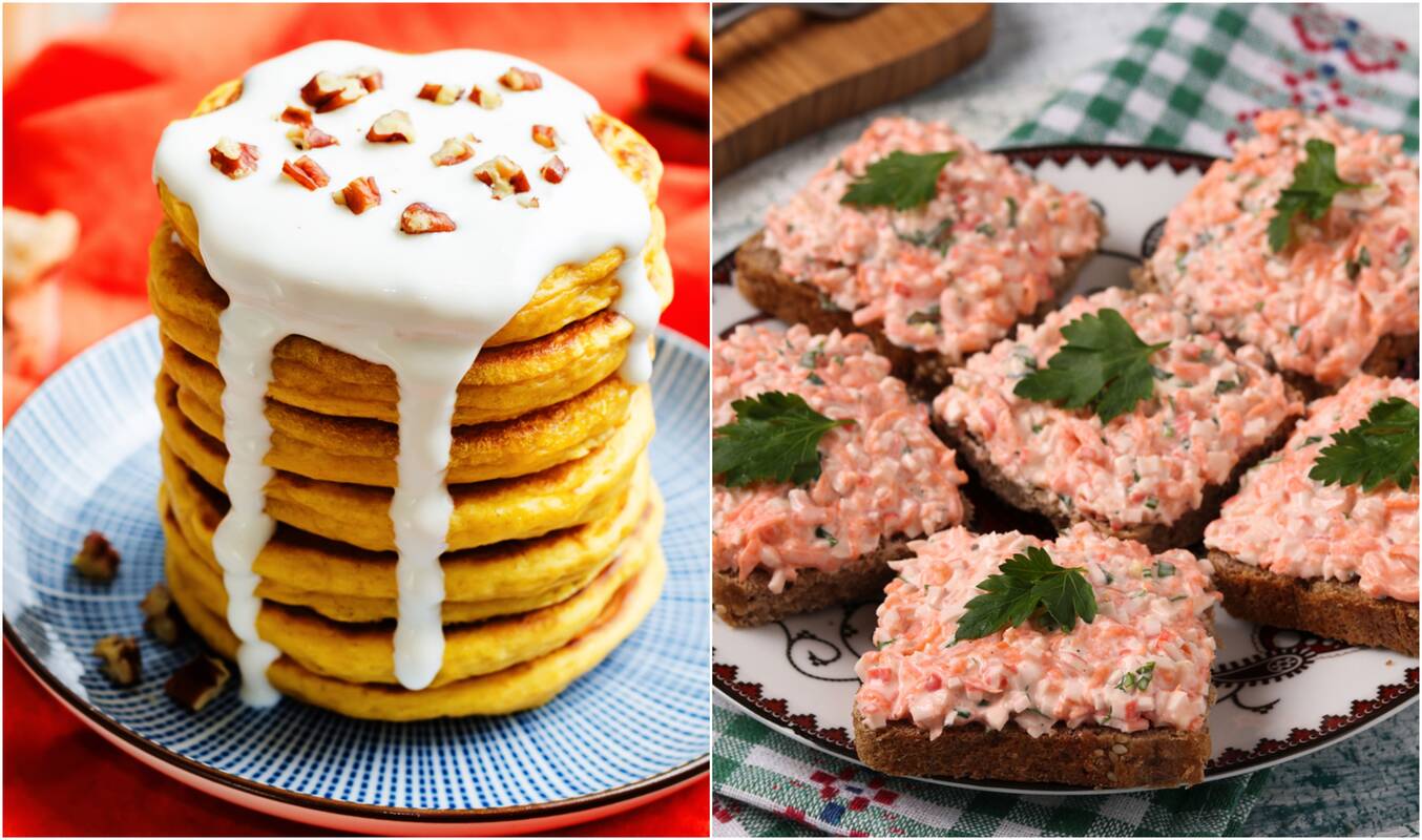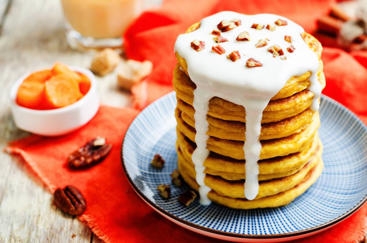 Saldūs ir purūs morkų blyneliai su jogurto ir riešutų padažu