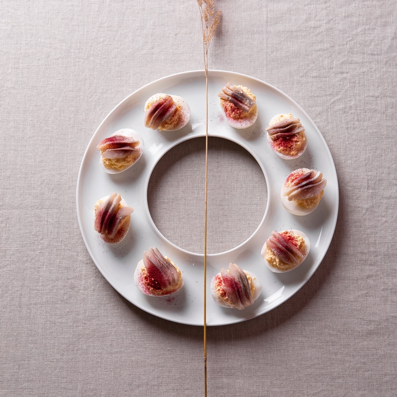 Rikota ir krienais įdaryti kiaušiniai su silke ir liofilizuotomis avietėmis