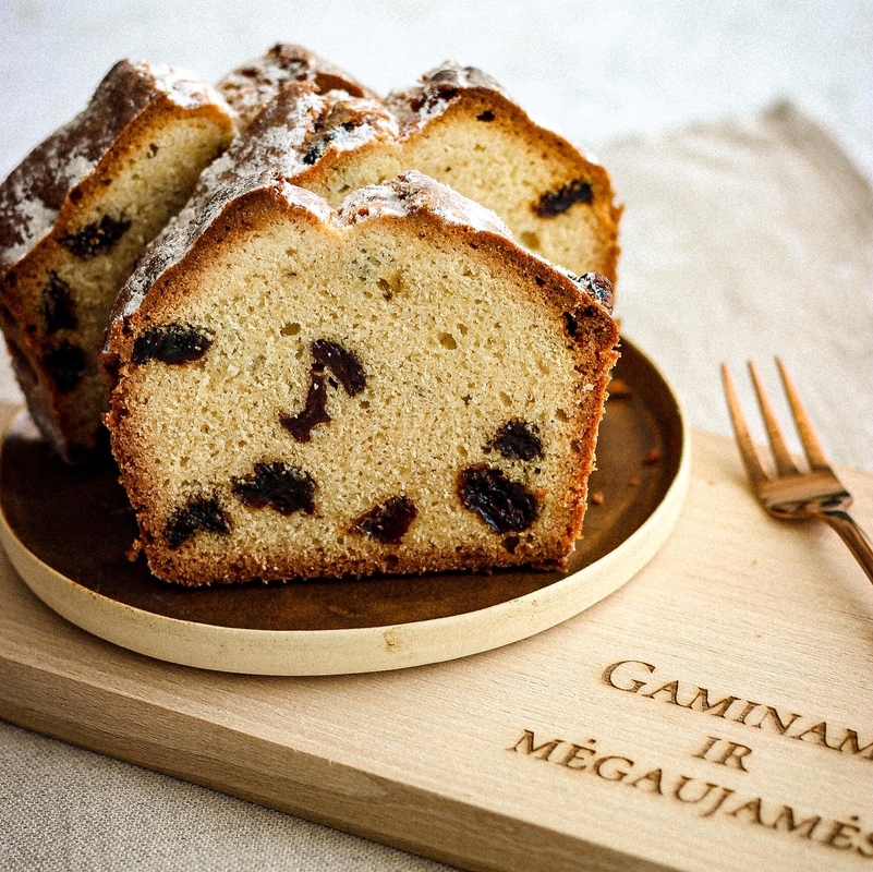 Razinas trumpam užpilkite verdančiu vandeniu, nuplaukite ir nusausinkite. Iki purumo išplakite sviestą su cukrumi ir vaniliniu cukrumi. Į sviesto masę po vieną įmuškite kiaušinius, kaskart gerai išmaišydami. Įsijokite miltus, sumaišytus su kepimo milteliais. Įmaišykite į tešlą razinas. Kepkite formoje, išklotoje kepimo popieriumi, 170 °C temperatūroje 1–1,20 val. Ar keksas iškepęs, patikrinkite mediniu pagaliuku. Jei viršus pradeda degti, uždenkite folija.