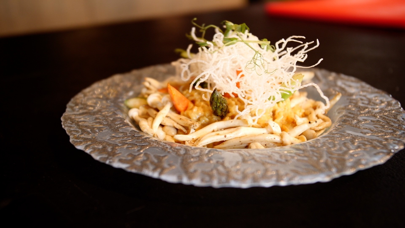 Žinomas kulinaras, TV3 laidos „Su Robertu lengviau“ vedėjas Robertas Ščesnavičius nustebino vasarišku, itališkų skonių prisodrintu patiekalu – rizotu, pagardintu morkų, smidrų ir grybų (shimeji) garnyru.