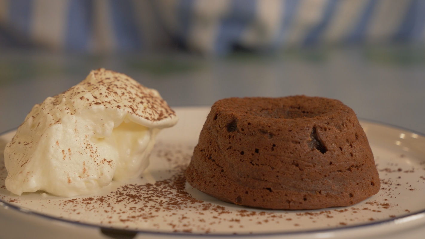 Iškepusius pyragaičius išimkite iš orkaitės ir ant keksiukų formos viršaus uždėkite medinę lentelę, kuri visiškai uždengtų visus pyragaičius. Atsargiai apverskite formą, kad pyragaičiai atsidurtų ant lentelės. Beliks atsargiai perkelti pyragaitį ant lėkštės, šalia įdėti šaukštą apelsininės grietinės ir papuošti kakava.