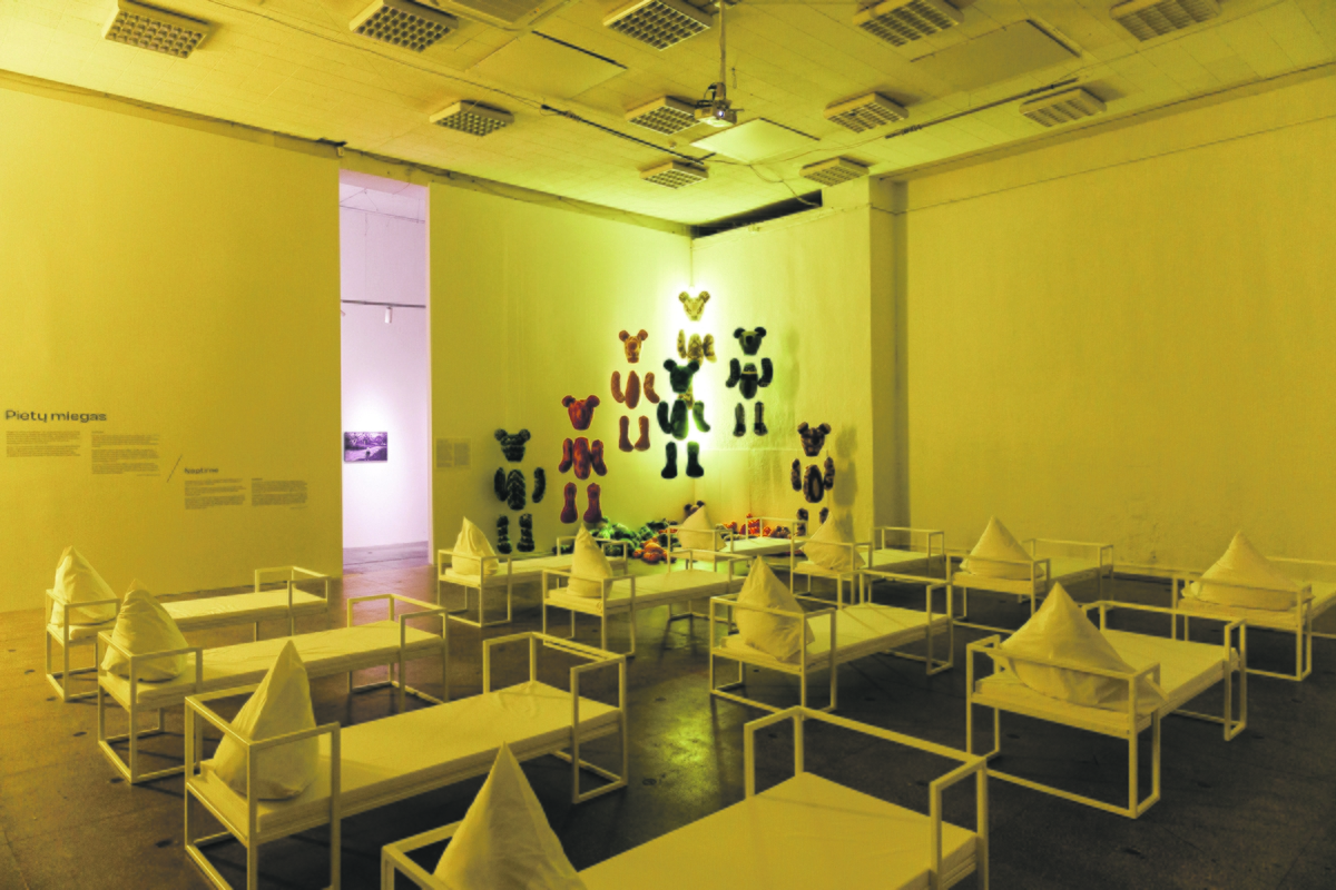 Minia: vienodos lovytės, vienodos trikampiais išrikiuotos pagalvės parodoje tampa unifikuotos vaikystės simboliu. / Edgaro Cickevičiaus nuotr.