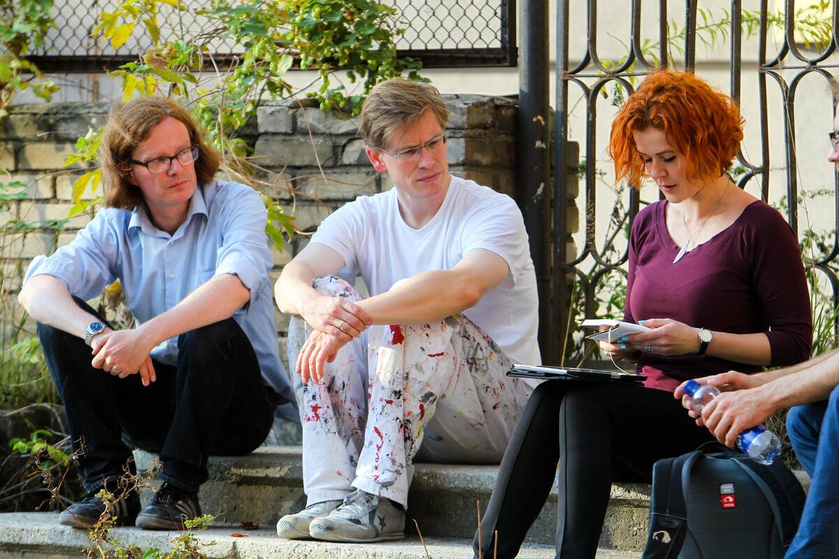 Su "Konsortium" grupės nariais kalbėjomės pačiame kūrybos įkarštyje, prieš oficialų parodos atidarymą, lauke susėdę ant cementinių laiptų, pro šalį zujant mašinoms. "Pastato viduje kol kas dar labai daug dulkių, o ir kėdžių neturime", – sako S.Freytagas.