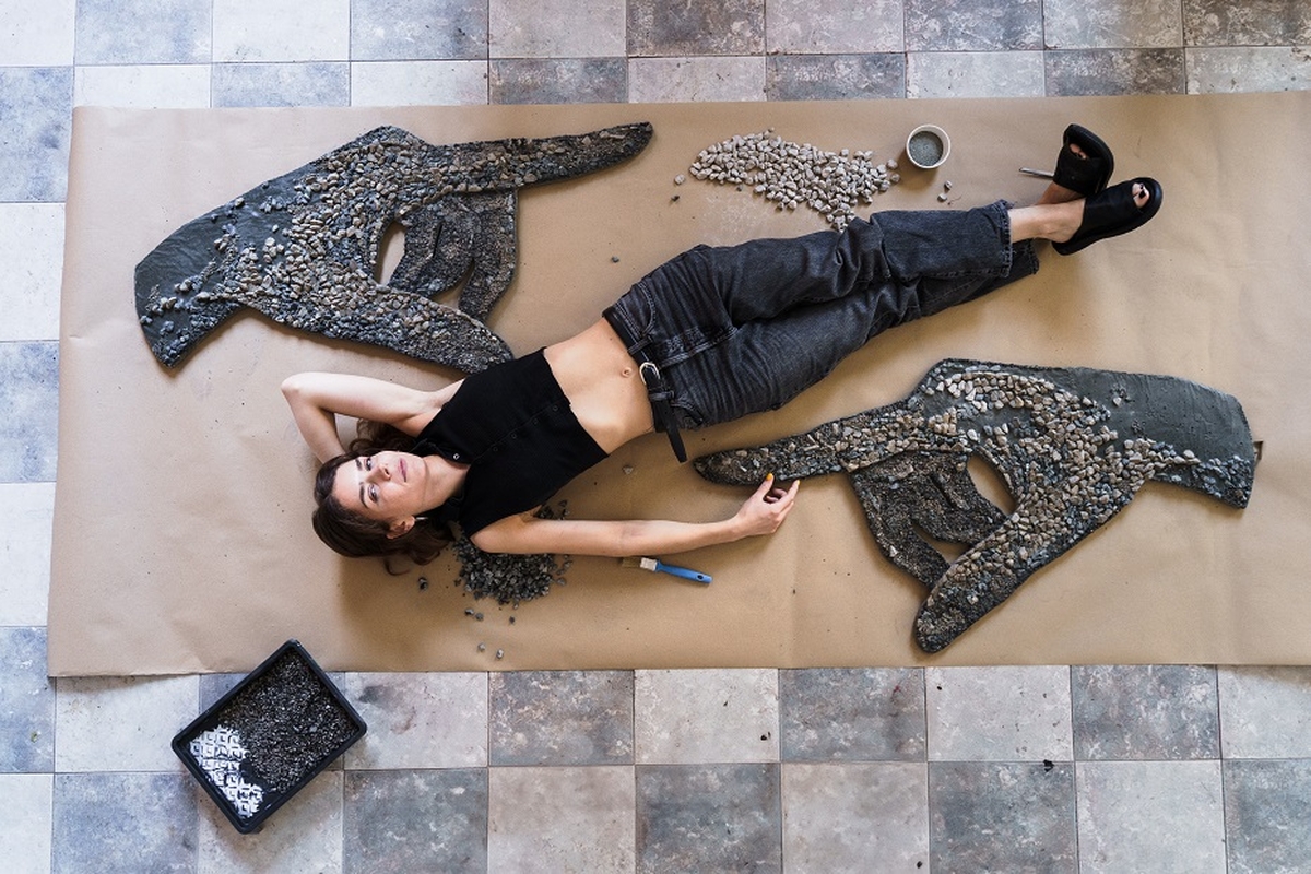 – Aš pati daugiausiai darbuojuosi su įvairiomis kasdienėmis medžiagomis ir tie kūriniai neretai būna trumpalaikiai, egzistuojantys tik tol, kol juos sugriauna, suvalgo, išardo, sudeda atgal į lentynas. O medžiaga, žinoma, visų pirma įpareigoją kūrėją, užduoda tam tikrą toną, apibrėžia instaliacijos gyvavimo trukmę. Viena vertus, akmuo yra itin įprastas materialas, su kuo dirba menininkai. Tuo tarpu man jis buvo naujas, nepažintas ir ypatingas. Akmuo pats savaime yra monumentalus, o tas didingumas lemia ir idėjos įkūnijimo svorį. Akmuo amžinas, vadinasi, kalbame apie ilgalaikę, tvarią žinią. Žinojau, kad kūrinys neturi atspindėti vienadienės aktualijos, todėl akmuo tapo toks – amžino ir nepajudinamo žmonių susitarimo liudininku. Nauja medžiaga mane išsviedė į nežinojimo plotmę, o nežinojimas man iš principo yra patrauklus ir aš renkuosi nežinoti, o tuomet ir atrasti, suprasti. Pradėjusi bendradarbiauti su „Kauno tiltais“, išsyk pagavome vizijos kryptį, minties gylį. Iš esmės darbas su granitu, dolomitu, panašiomis dulkančiomis medžiagomis manęs negąsdino, kadangi esu daug dirbusi su žeme, medžių šakomis ir t. t. Mane žavi daiktai, kuriuos matome kasdien ir kurie mums tampa įprasti. Tokios medžiagos, kurias puikiai pažįstame, žinome jų tekstūras, atsiskleidžia naujame formate, o pastarąjį galima paversti nauju žvilgsniu į tą medžiagą. Konkrečiai instaliacijai „Rankos, tiesiančios tiltus“ vietomis paformavau akmenis, ieškodama būdų atskleisti idėją. Svarsčiau, jog savotiškai galiu šiek tiek pakloti asfaltą ir turėti estetinę pretenziją į jį, nes man tai gražu. Rankos visos padengtos granito sluoksniu, atrodančiu kaip asfaltas. Tuomet it mozaiką guldžiau skirtingų frakcijų dolomito ir granito skaldos akmenukus. Kurti verta vien dėl momento išvystant įprastos medžiagos metamorfozę ir kismą iš esmės.