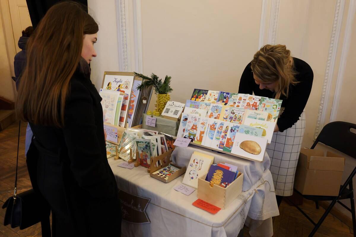 Fotomenininkė Rusnė Kuliešiūtė ant stalo išsidėliojusi atvirukų, printų, knygų skirtukų, medžiaginių padėkliukų. Populiariausi – atvirukai. „Ne, neatvirauja, kam siųs, kam dovanos“, – sakė mergina. Ji pati – dažna mugių lankytoja dėl įvairesnio asortimento. Jose ieško ir dovanų.