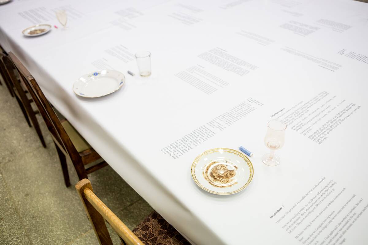 Berlyne gyvenanti M.V.Tronsosco Guzman rezidavo Sakartvele, Tbilisyje. Migrantų istorijomis besidominti menininkė rezidencijos metu bendravo su pabėgėliais iš Pietų Osetijos. Galiausiai kūrėja pakvietė juos vakarienės prie stalo, kuris buvo uždengtas staltiese su išsiuvinėtomis pačių pabėgėlių citatomis. M.V.Tronsocso Guzman paruošė čilietiškų patiekalų, sėdo su savo tyrimo dalyviais prie bendro stalo ir visi drauge dalijosi patirtimis. Šia migrantų istorijomis išsiuvinėta staltiese uždengtas ir stalas galerijoje.