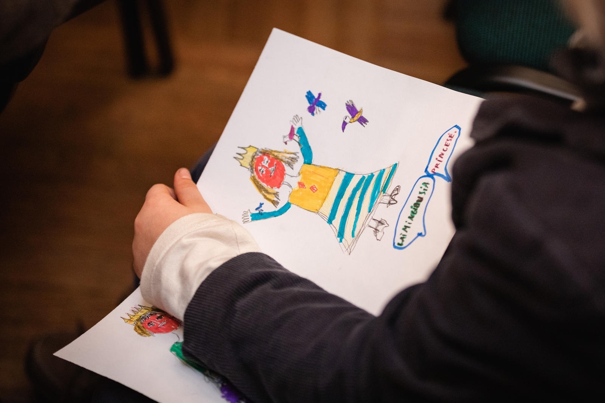 Nuo kėdės pašokęs pirmokėlis iš pašonės traukė vaizdinę medžiagą – savo piešinį, kuriame buvo įtupdyta ne viena, o dvi kilmingos damos. Viena – su puošnia suknele ir deimantais ausyse, kita – tokia pat išsipusčiusi, bet su šeima, draugais ir glėbiu žaislų.