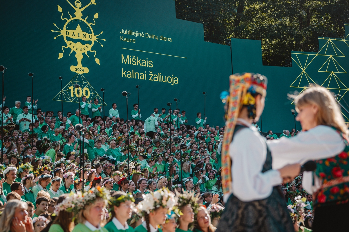 Pirmoji Lietuvos dainų šventė 1924 m. įvyko Kaune. Jubiliejinė Dainų dienos „Miškais kalnai žaliuoja“ programa įkvėpta Dainų šventės vedlių – Juozo Naujalio, Juliaus Štarkos, Stasio Šimkaus – pasakojo apie tiltus, kuriuos daina per 100-metį nutiesė iki šiuolaikinės valstybės ir jaunatviško Kauno.