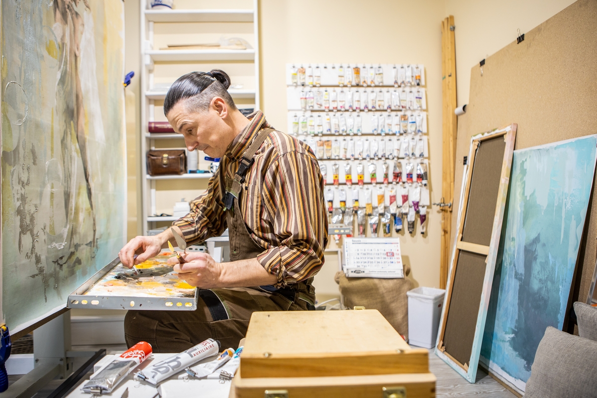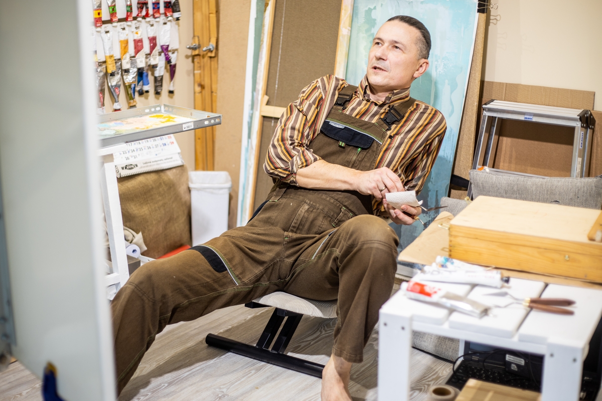 Jonas tapo basas, apsivilkęs darbiniu kombinezonu. Kai jo rankoje mentelė, studijoje skamba mėgstama muzika. Neretai – garso knygos arba jam aktualaus turinio laidos. Taip vyras suderina tapymo malonumą su nauda. Iki pietų drauge su juo studijoje būna ir žmona, kuri tarsi pilkasis kardinolas rūpinasi, kad darbai iš studijos pasiektų naujuosius šeimininkus, galerijas, o žinia apie vyro virtuoziškumą pasklistų kuo plačiau.