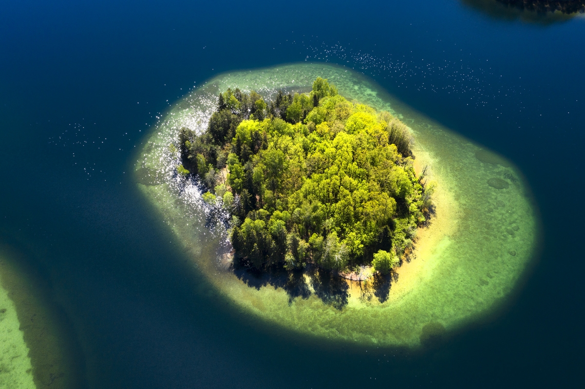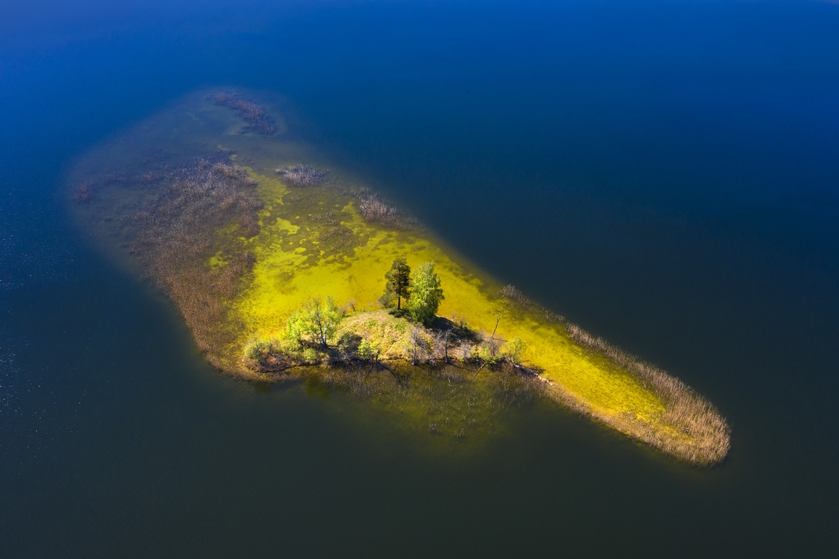 Tai, kas matoma tik iš viršaus. R. Požerskio fotografijose matome salas. Iš aukštai, pasitelkus droną, užfiksuotos įspūdingos sausumos konfigūracijos, pasklidusios įvairių Lietuvos regionų vandenyse: Zarasų krašte, Platelių, Veisiejų ežeruose ar kitur. Priešais akis ryškėja gyvūno ar vandens lašo pavidalai, širdies ar plaštakos kontūrai – autorių sudominę ir efektingai išryškinti salų vaizdai, turintys asociatyvinių galių.