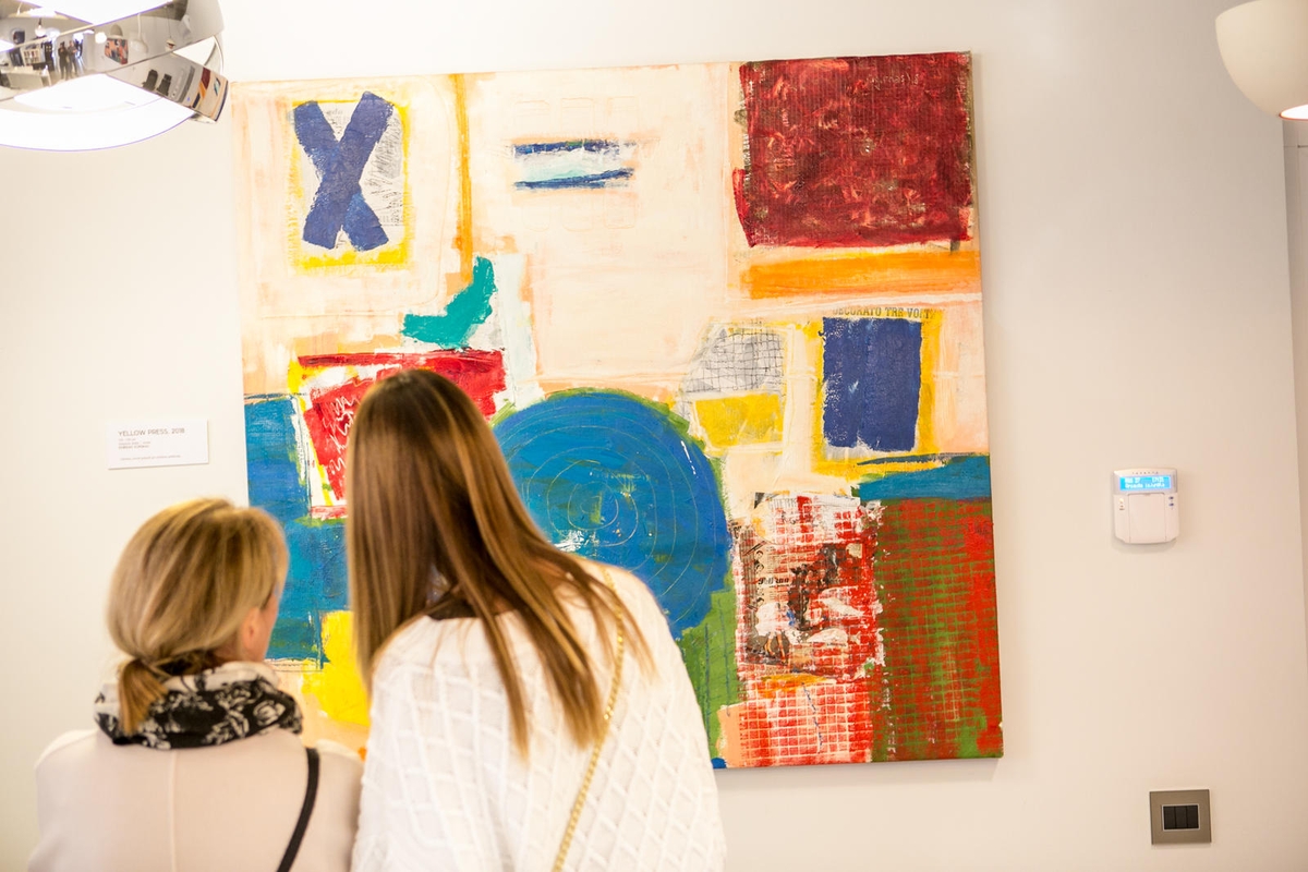 Skirtinguose žiūros aukščiuose išdėliota ekspozicija žiūrovui suteikia galimybę erdvėje judėti įvairiomis trajektorijomis. Tai labai svarbu žiūrint į E.Scinsko darbus, nes jo kūriniai ekspresyvūs – tapybinis veiksmas juose aktyvus: daugybė spalvinių dėmių, skirtingomis kryptimis judančių potėpių, faktūrų, atsirandančių panaudojant koliažo elementus.