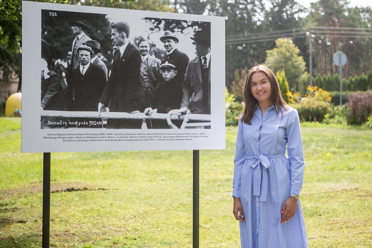 1925 m.: nuotraukos centre šypsosi Kipras Petraukas (1885–1968) – visų laikų žymiausias Lietuvos operos dainininkas – tenoras, dainavęs Lietuvos teatre Kaune, Sankt Peterburgo Marijos teatre, Maskvos Didžiajame teatre, Milano "La Scaloje", Operos ir baleto teatre Vilniuje, gastroliavęs Barselonoje, Paryžiuje ir Romoje. Nuotraukoje jis drauge su žymiuoju režisieriumi, dramaturgu Borisu Dauguviečiu stebi Kaune dviračių lenktynes. (A. Burkaus kolekcijos nuotr.)