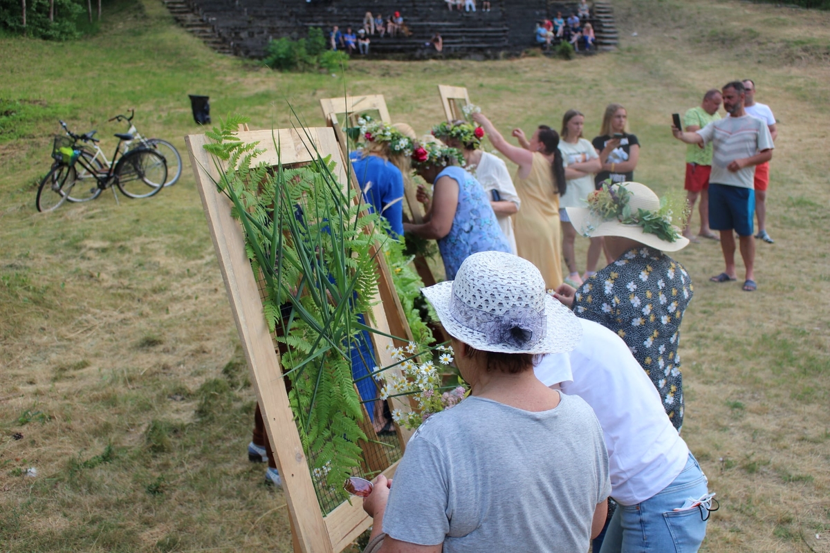 Naujovė: Karmėlavos seniūnijos Joninėse dalyvės kūrė gėlių paveiklus. / Seniūnijos nuotr.