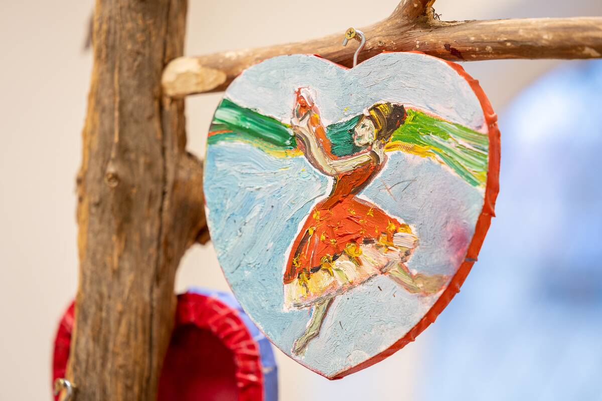 Galerija išskirstyta į keturis kambariukus, tad pradėsiu nuo paties didžiausio – jį pavadinsiu žaisliukų kambariu. Ši erdvė pilna ne tik mums įprastų Kalėdų žaisliukų – spragtukų ir pelių iš baleto „Spragtukas ir Pelių karalius“, bet ir sentimentalių, ne tik Kalėdų žaisliukų: stiklinių sniego burbulų, nestandartinių eglutės žaisliukų: klounų, grybukų. Parodoje išvystame ir objektų, vienas jų – po stiklu: saugiai paslėptas nuo pasaulio baisybių tupi į klouną panašus žmogelis, o šalia jo – ryški raudona iš karoliukų sunerta eglutė.