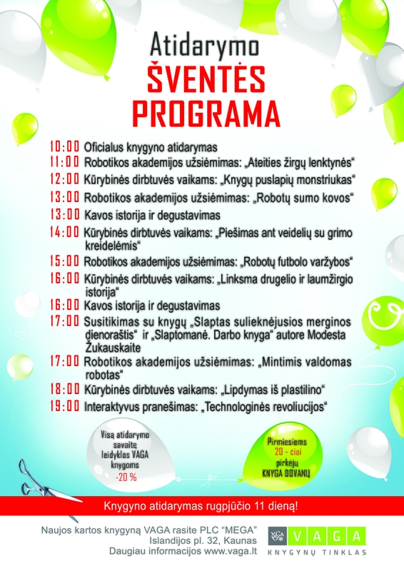 Knygyno atidarymo šventės metu kiekvienoje iš keturių erdvių vyks renginiai: robotų sumo ir futbolo varžybos, kūrybinės dirbtuvės vaikams, susitikimas su knygų „Slaptas sulieknėjusios merginos dienoraštis“ bei „Slaptomanė. Darbo knyga“ autore Modesta Žukauskaite, kavos degustacijos bei pasakojimai apie jos istoriją. Lankytojai su šeimomis galės išvysti net mintimis valdomą robotą.