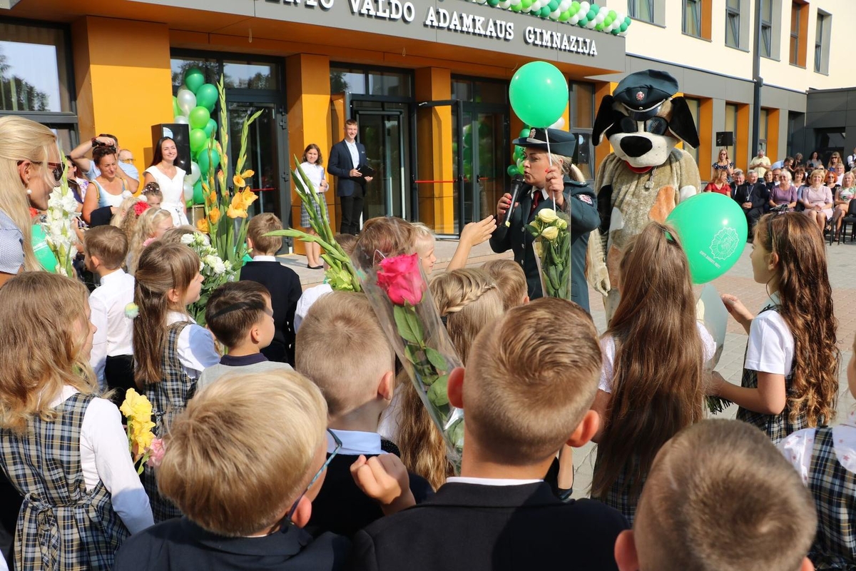 Šventiškai nusiteikusius moksleivius pirmąją mokslo metų dieną visoje apskrityje sveikino ne tik gausus būrys pareigūnų, bet ir policijos bičiulis Amsis. Jis priminė vaikams, jog atšvaitą reikia dėvėti dešinėje drabužių pusėje, tam, kad priešais atvažiuojantys automobilių vairuotojai jau iš tolo juos matytų.