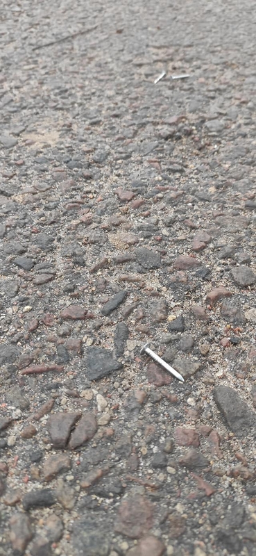 Prie šio įrašo socialiniame tinke pasidalyta ir aprašomo atvejo nuotraukomis, kuriose matyti ant asfalto nedideliais tarpais paberti vinys.