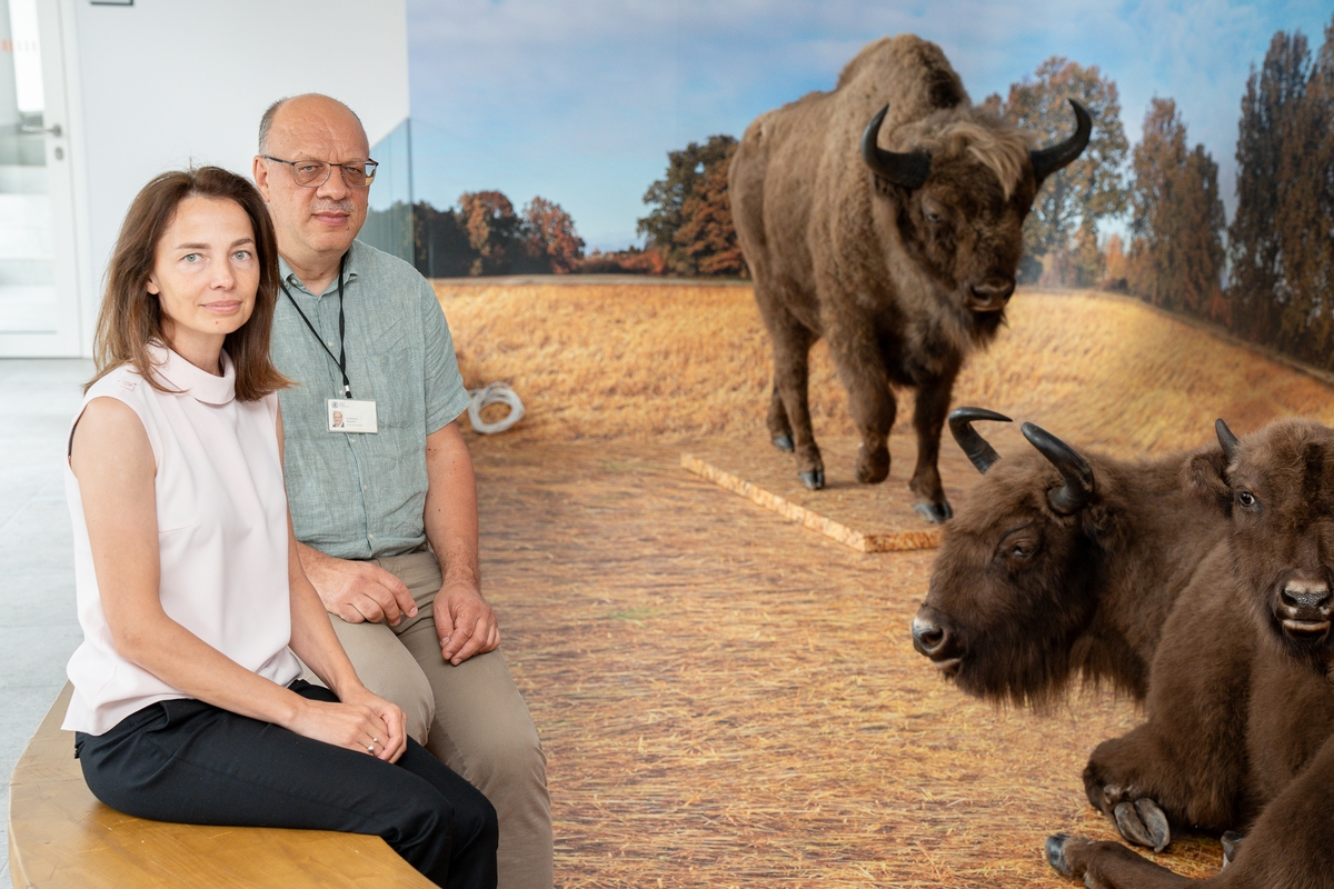 Vytauto Didžiojo universiteto (VDU) Agroinovacijų centro fojė puošia stumbrų iškamšos, įkomponuotos prie fotodrobės su tolumoje matomu Krekenavos miestelio vaizdu. Jame kasmet apsilanko stumbrai, o pernai užsuko net 27 stumbrų banda.
