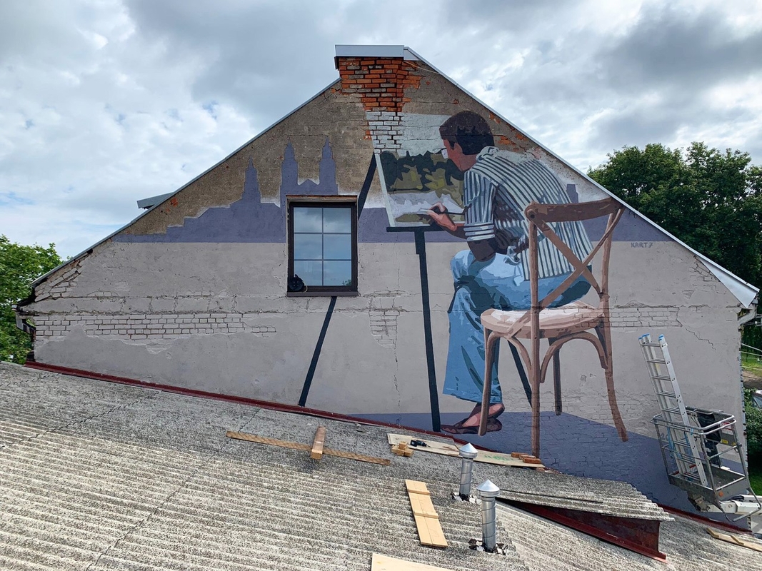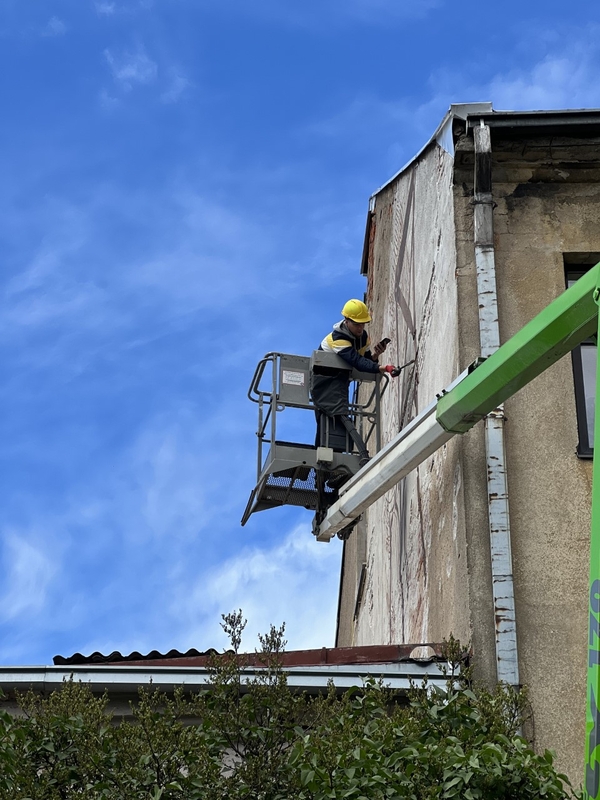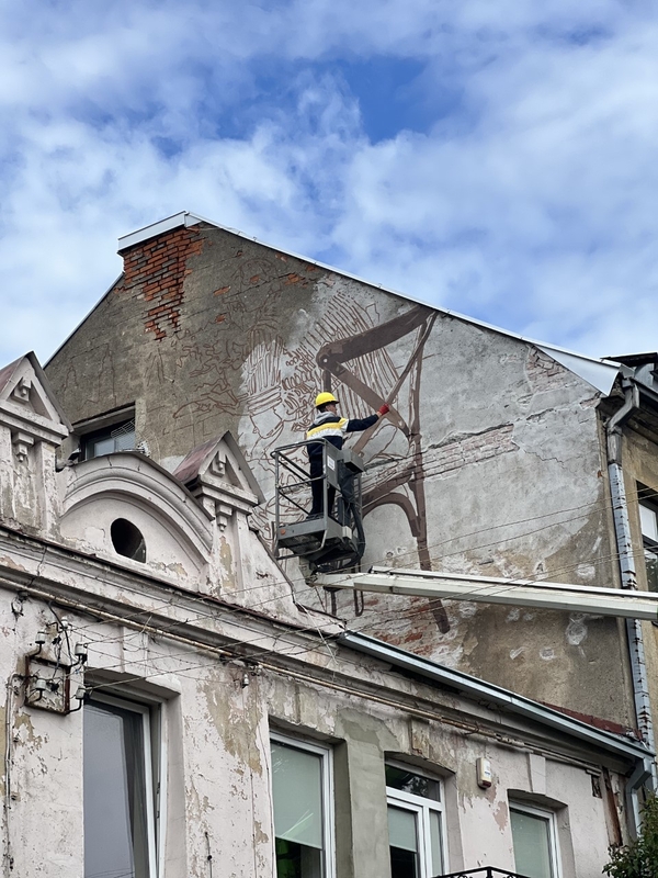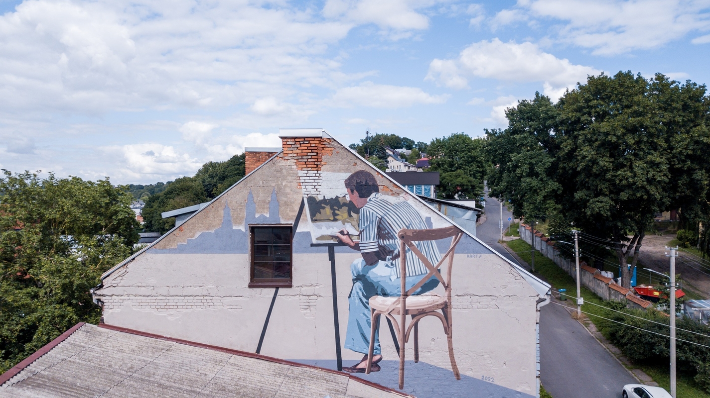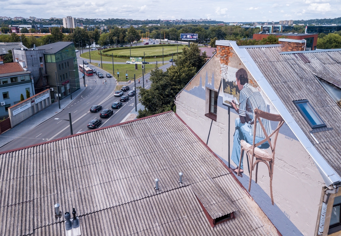 Tapymas ant išorinių pastato sienų jam nebuvo naujiena. Čia taip pat prireikė keltuvo. „Tiesa, vieta nebuvo tradicinė ar labai paprasta, nes namo stogas buvo nuožulnus, ne visas vietas pasiekė keltuvas, todėl buvo šiek tiek iššūkis dar papildomai naudotis ir kopėčiomis. Aukštis – tikrai nemažas, o dar nuožulnus stogas su kopėčiomis. Bet viskas pavyko sklandžiai“, – sakė L.Kaziulionis.