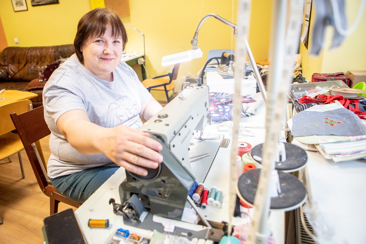 Dar vienos kūrybos erdvės įrengtos antrame aukšte. Nedidelėse socialinėse dirbtuvėse kasdien nuo ryto iki pietų meistrauja protinę negalią turintys žmonės. Tądien, kai lankėmės pas samariečius, palinkę prie stalo darbavosi keturi darbštuoliai. Trys jų atidžiai rinko skirtingų spalvų karoliukus ir vėrė ant tamprių silikoninių siūlų, ketvirtasis – klijavo etiketes.