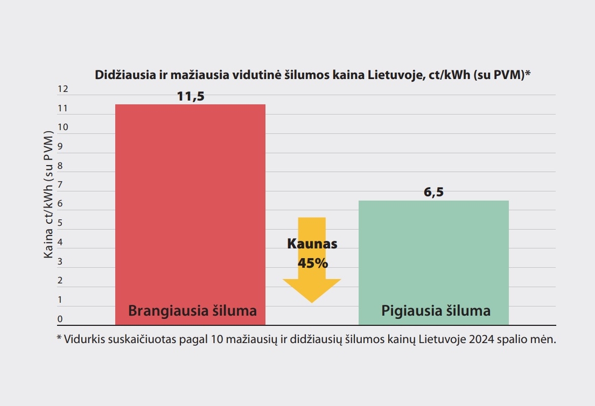 Lietuvoje centralizuotai šilumą tiekia apie 50 įmonių. Valstybinės energetikos reguliavimo tarybos (VERT) skelbiamais duomenimis, brangiausiai šiluma kainuoja mažesniuose rajonuose ir miestuose – apie 11,5 ct/kWh (su PVM), Kaune ir kituose didmiesčiuose šilumos kaina yra beveik dvigubai mažesnė. Palyginti su brangiausia šalyje šilumos kaina, Kaune ji yra 45 proc. mažesnė.