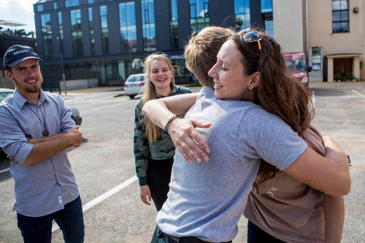 "Eugenijus mus tikriausiai bando pratinti prie Indijos ritmo – ten niekas nevyksta laiku", – kol laukėme kunigo E.Markovo SJ, kad prisidėtų prie bendros nuotraukos, juokavo Kauno Jėzuitų gimnazijos socialinė pedagogė Eglė Labutytė. Ji kaip ir Kauno jėzuitų gimnazijos kapelionas bei trys gimnazistai Greta Minelgaitė, Aurelijus Ramanauskas ir Motiejus Krutulis jau antradienį bus Varšuvoje, iš kurios skris į Indiją.