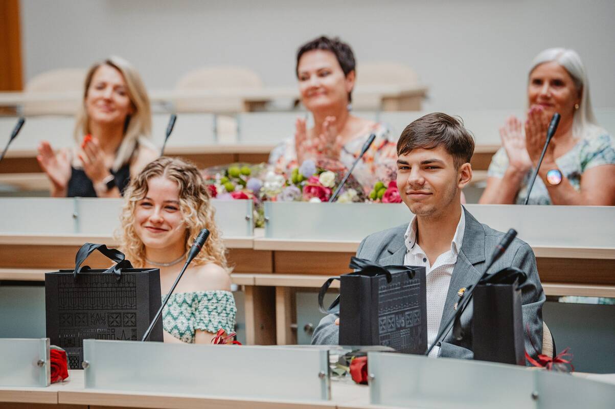 Visų susirinkusių mokinių vardu noriu padėkoti už įrodymą, kad pastangos vertinamos, už motyvaciją toliau tobulėti, siekti savo svajonių ir tikslų. Ačiū, kad remiate Lietuvos ateitį“, – šimtukininkų vardu dėkojo Kauno „Saulės“ gimnazijos abiturientas Ainis Lukša.