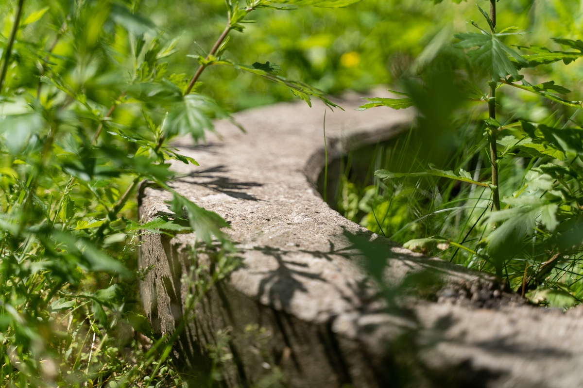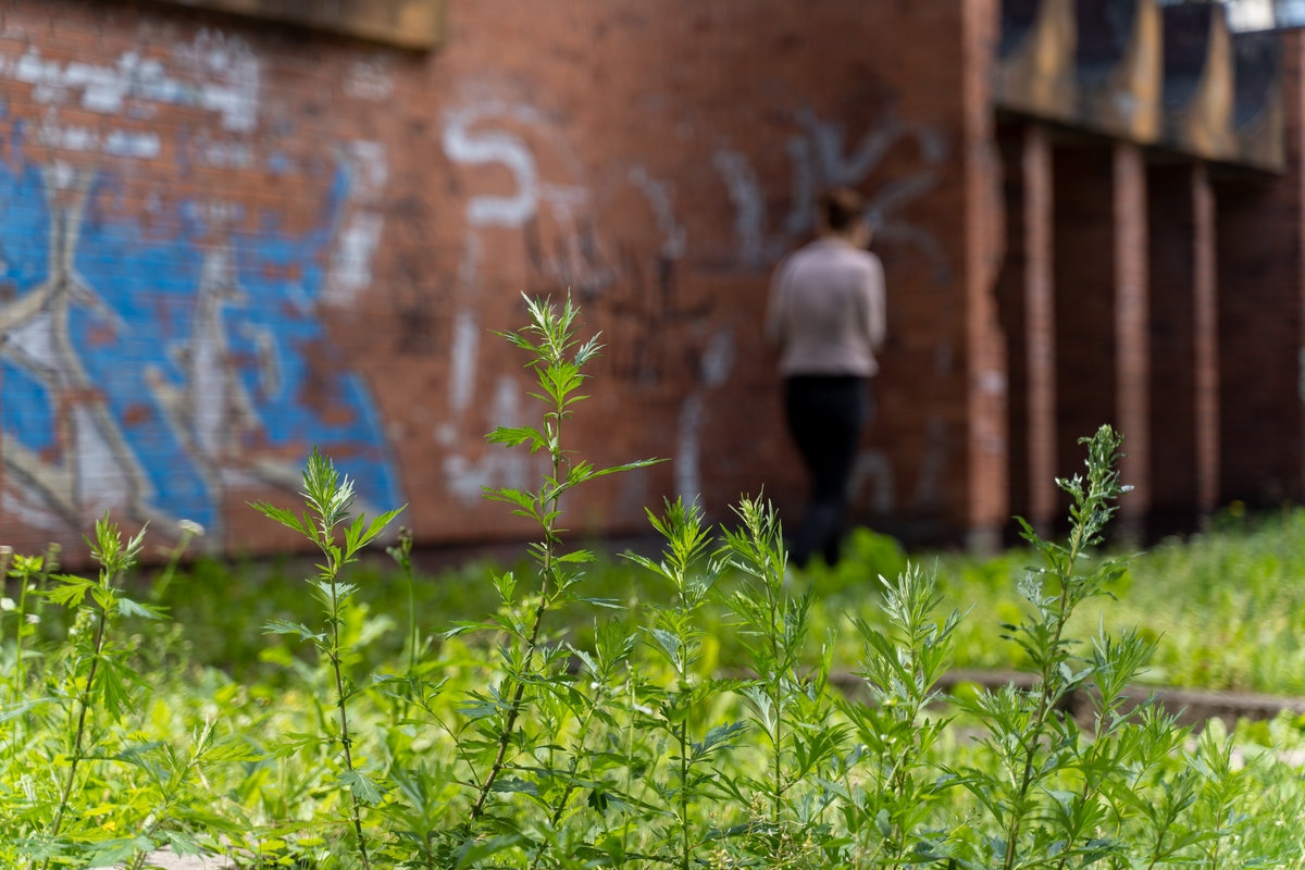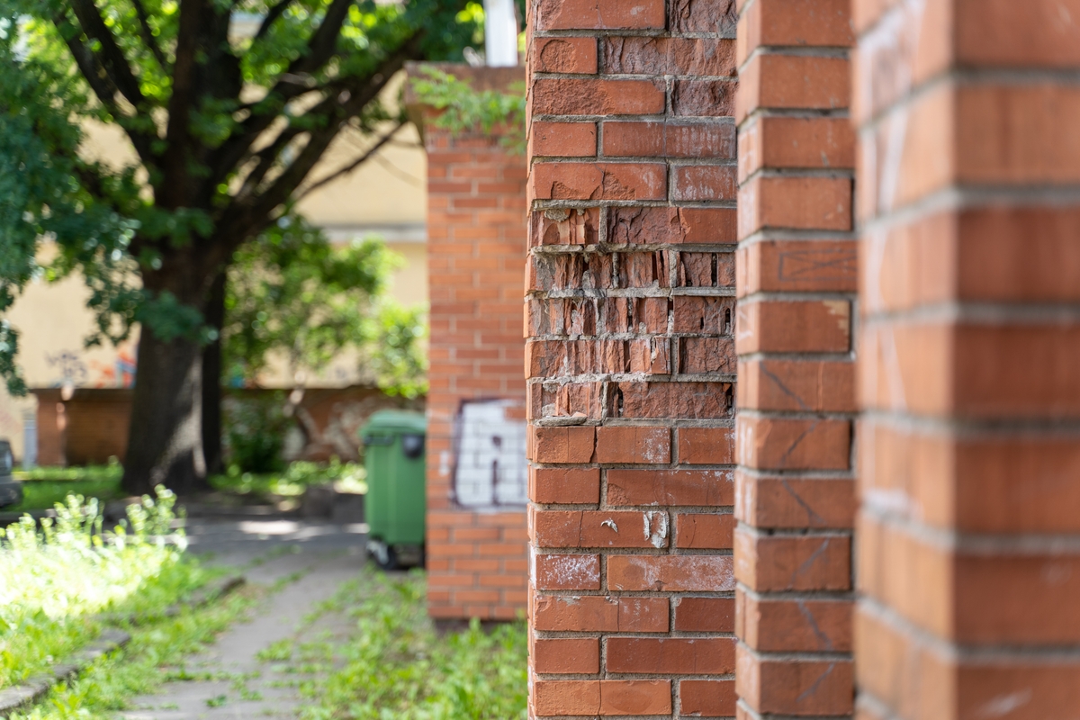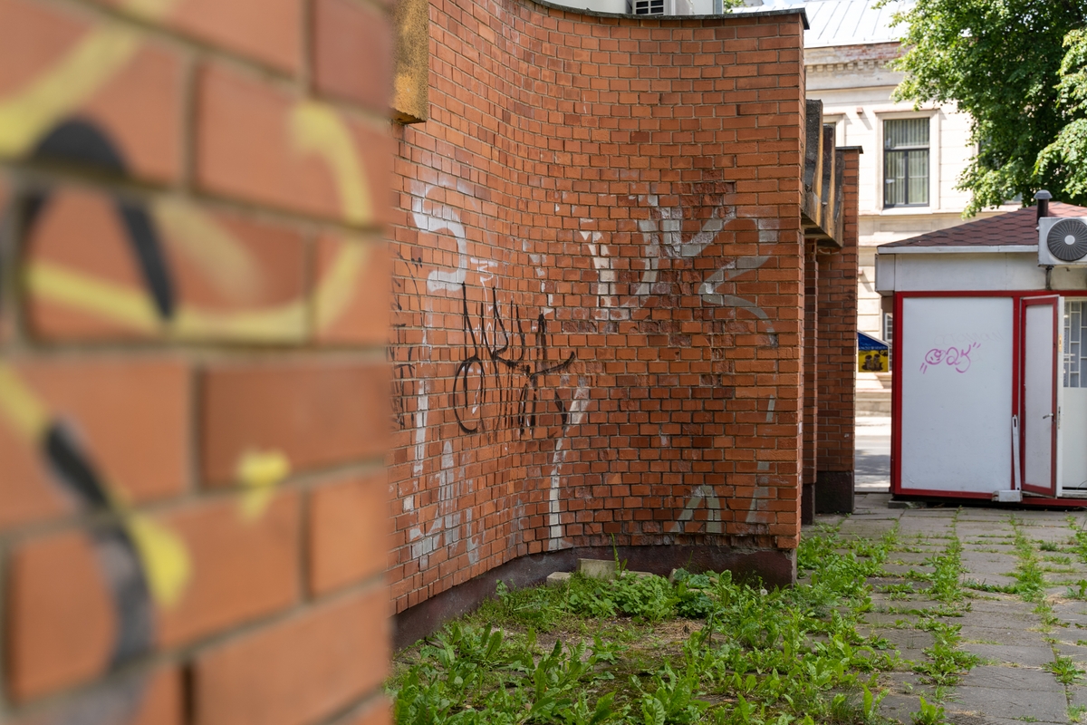 Į akis labiausiai krinta raudonai grafičiais išpaišytos sienos ir išsiklaipiusios grindinio plytelės. Erdvės viduryje anksčiau dar buvo sunkiai atspėjamos paskirties apskriti nedideli statiniai su stogeliais. Šios būdelės jau seniai buvo nenaudojamos.