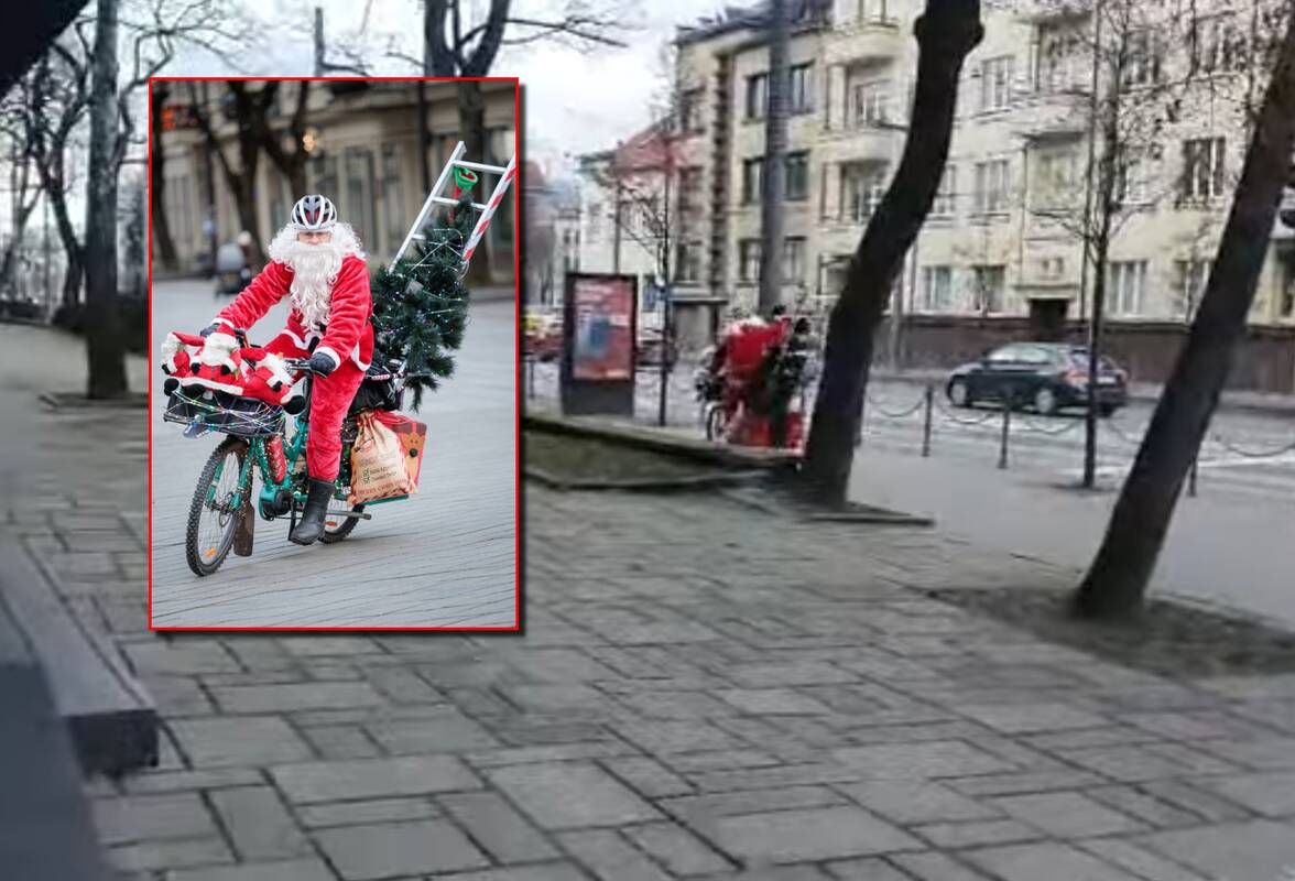 Štai Kauno gatvėse užfiksuotas Kalėdų Senelis, važiuojantis dviračiu. Tačiau jo transporto priemonė – išskirtinė, dekoruota lemputėmis. Be to, Kalėdų Senelis pritvirtino eglutę, dovanų maišus, net kopėčias, kurios, matyt, jam padeda užlipti ant stogo ir po to pro kaminą įlindęs jis palieka vaikams dovanų.