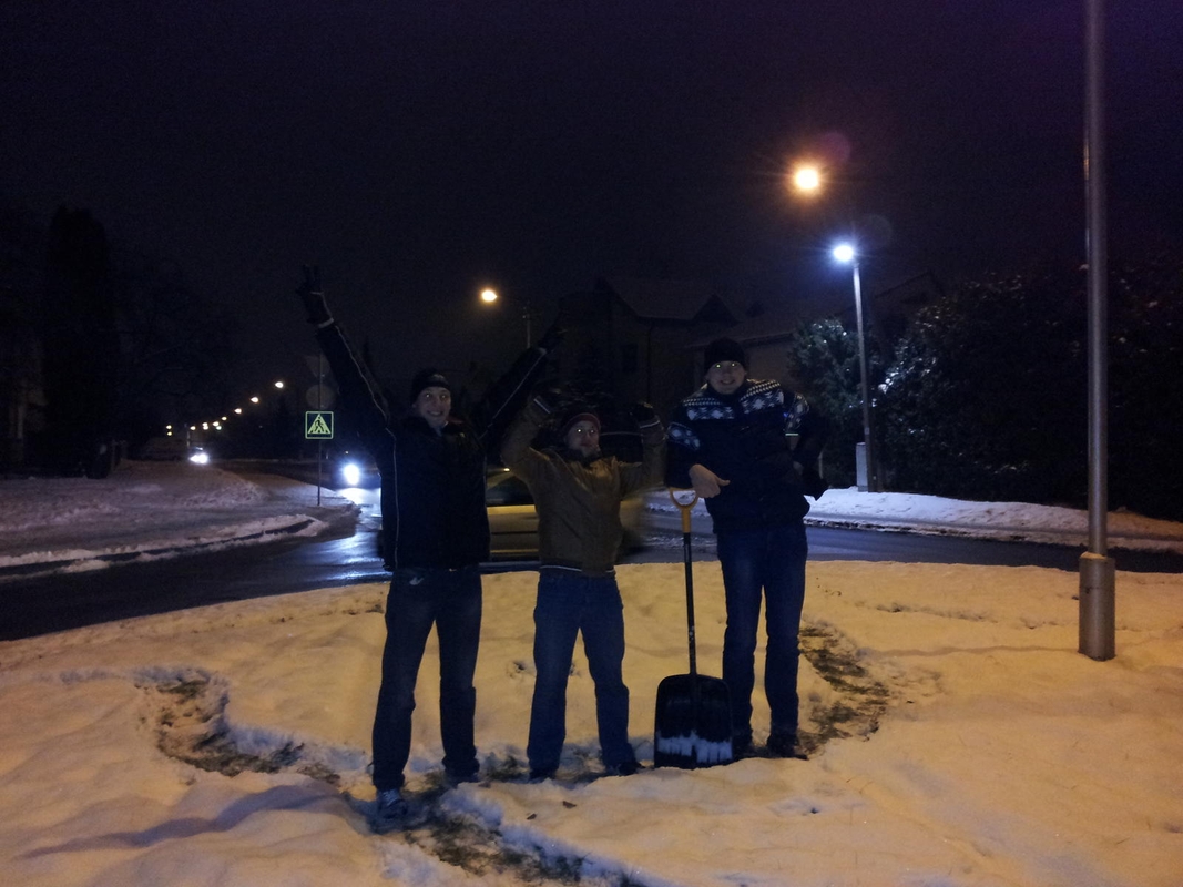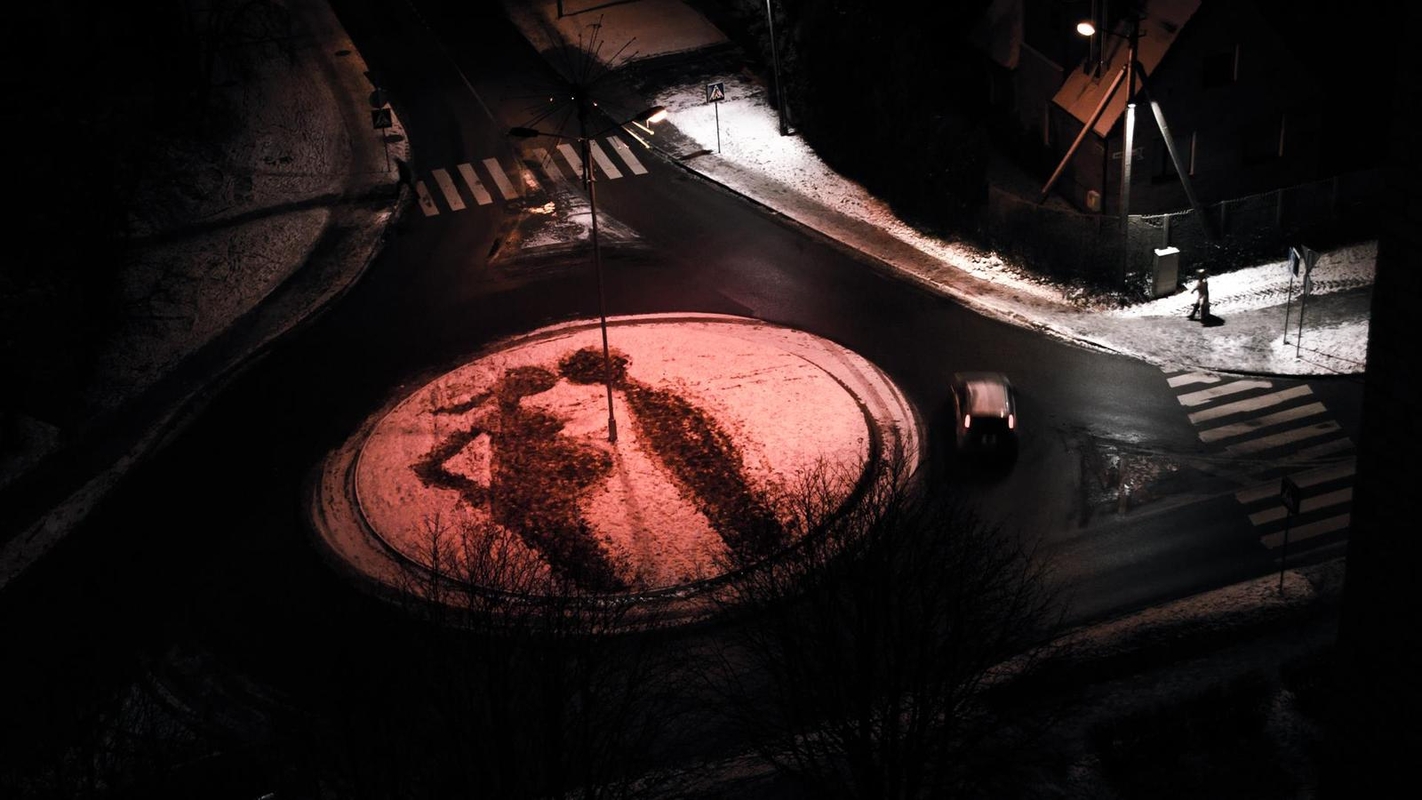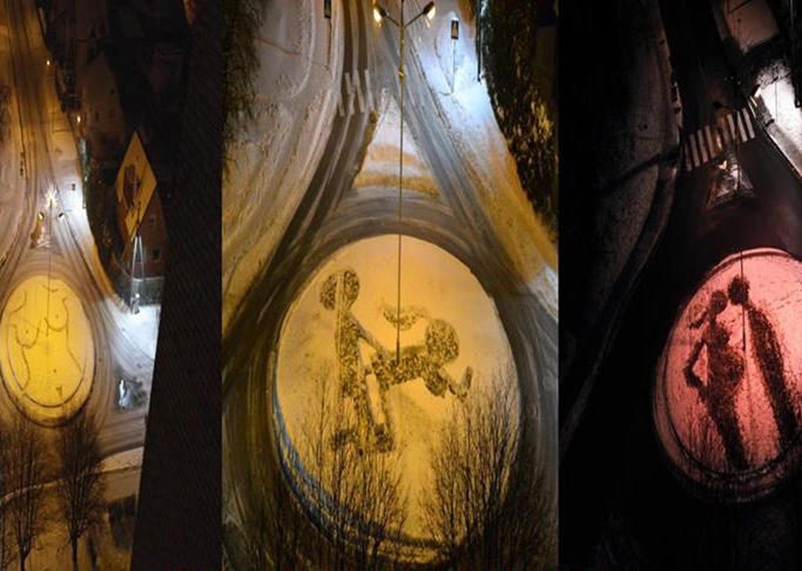 Kauno technologijos universiteto (KTU) studentai vėl nustebino – Pašilės ir Dujotiekio g. sankryžos centre jie sukūrė sniego piešinį, kuriame pavaizduota vaikelio besilaukianti porelė.