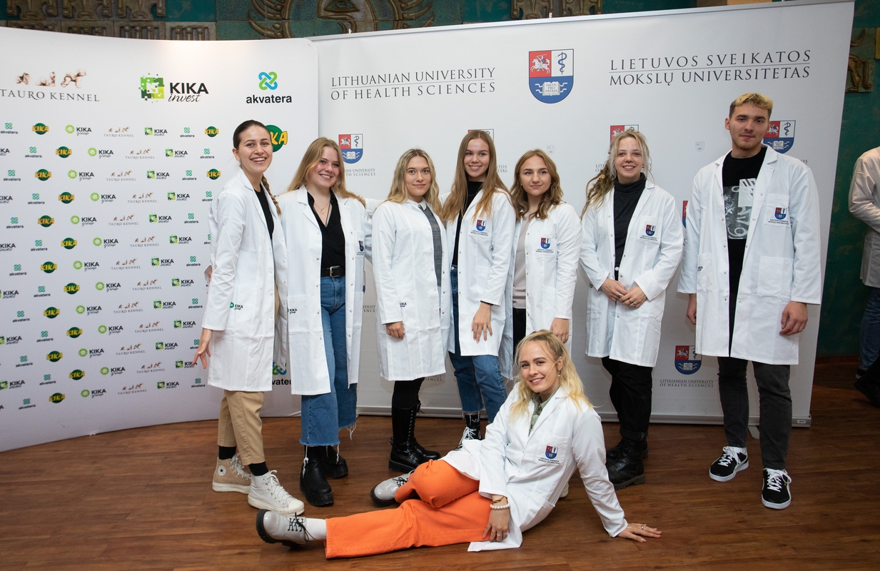 Iškilmių metu veterinarinės medicinos studijas pasirinkusiems LSMU pirmojo kurso studentams KIKA GROUP bendrasavininkis T. Plungė įteikė būsimos profesijos simbolį – baltą chalatą.