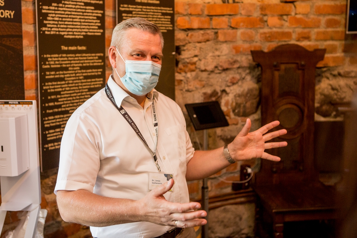 "Anksčiau ateidavo daug moksleivių grupių, kurios čia lankydavosi pagal Kultūros paso programą", – svetingai atvėręs pirmojo aukšto duris, Kauno miesto muziejaus Pilies skyriaus vedėjas prof. dr. Jonas Vaičenonis kvietė į nedidelę ekskursiją po pilies vidų. Jei mano vietoje būtų grupė svečių iš užsienio, pirmiausia profesorius jiems būtų papasakojęs apie pilies radinius, tada pakvietęs nusileisti laiptais žemyn, vėliau pakilti į likusius du aukštus. Pasižvalgyti po parodą, kurią pristato karantino vaizdų savo kieme įkvėpti Kauno menininkai.