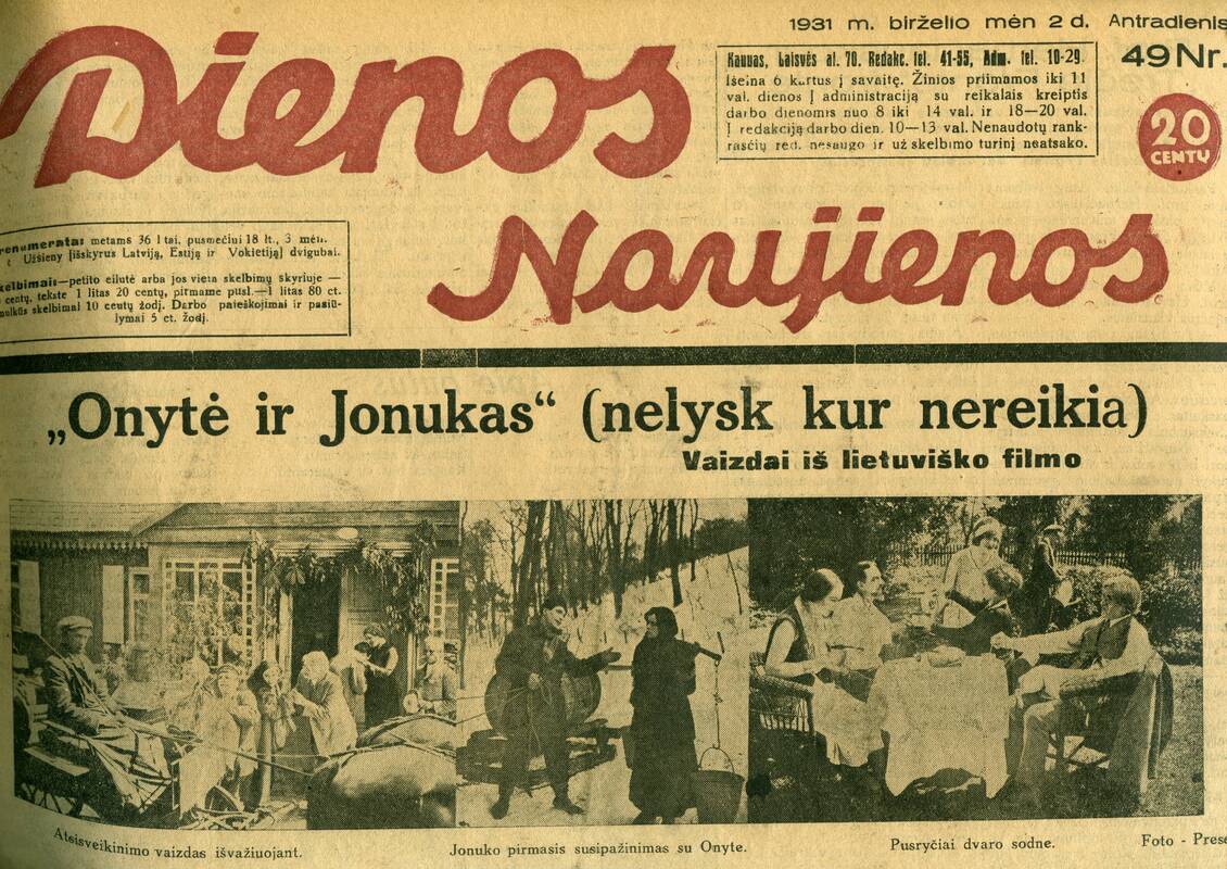 „Onytė ir Jonukas“ (nelysk kur nereikia): Vaizdai iš lietuviško filmo: [šis filmas pirmą kartą rodytas kino teatre „Forum“] / Dienos naujienos. – 1931, birž. 2, p. 1