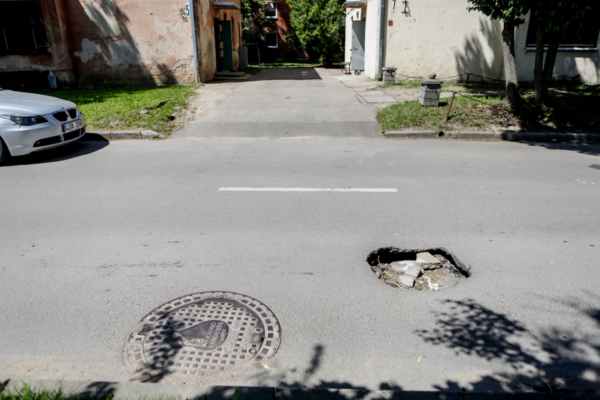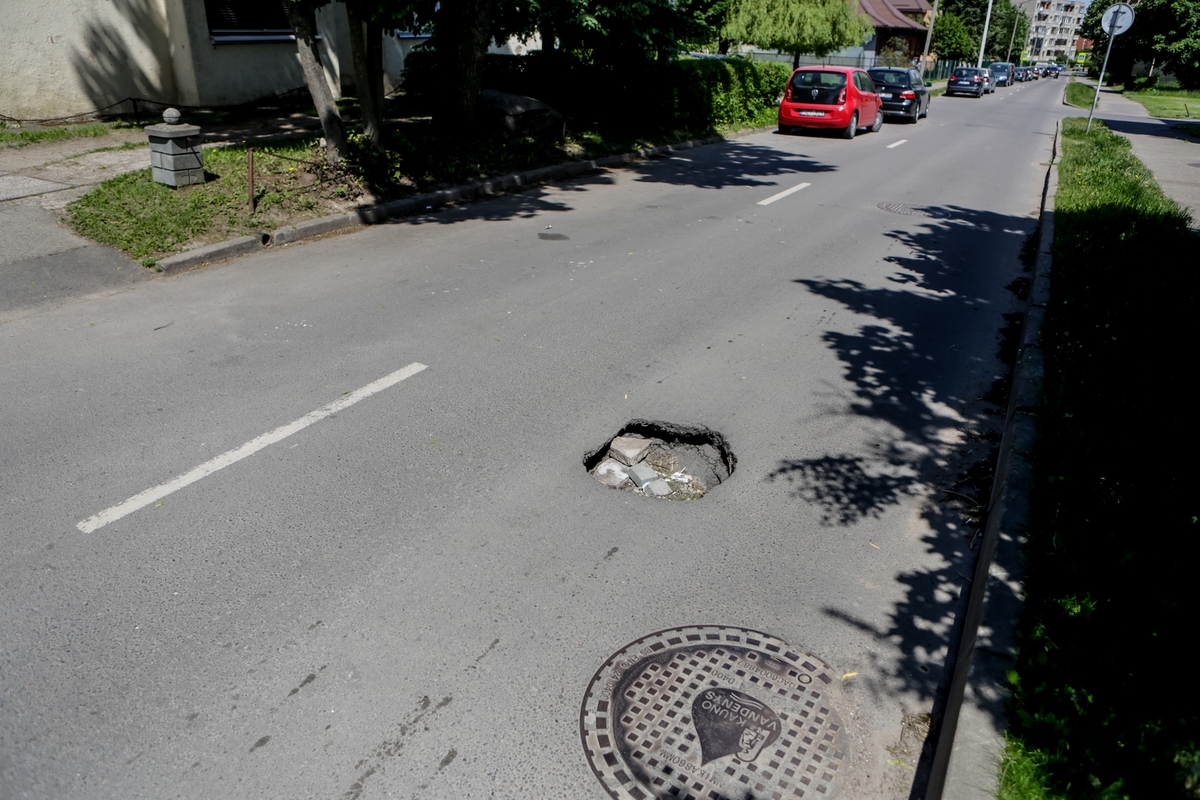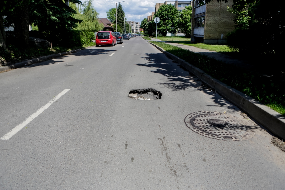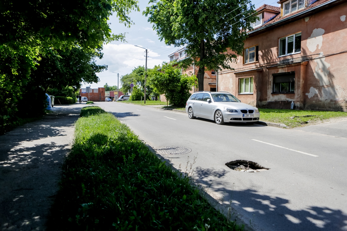 „Gatvė yra siaura – dviejų juostų“, – pasakojo vyras. Viena juosta dažnai būna užstatyta automobiliais, o kitoje yra ta nelemta duobė, tad pravažiuoti kai kada būna itin sudėtinga.