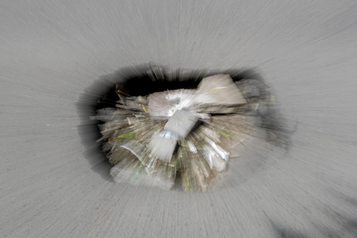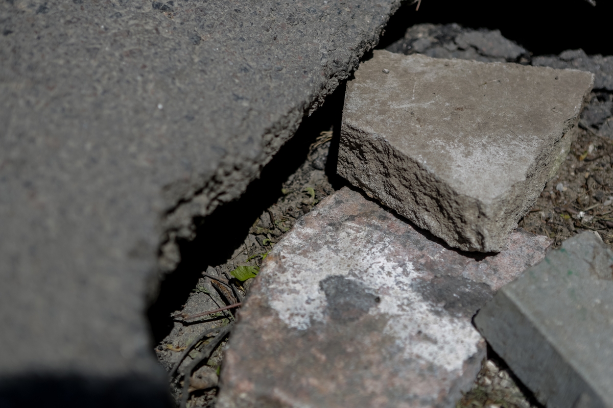 Įgriuvęs asfaltas. Gylį sunku nusakyti, nes į ją visko primesta, priversta. Kas ką gali. Verčia žoles, pila šiukšles.