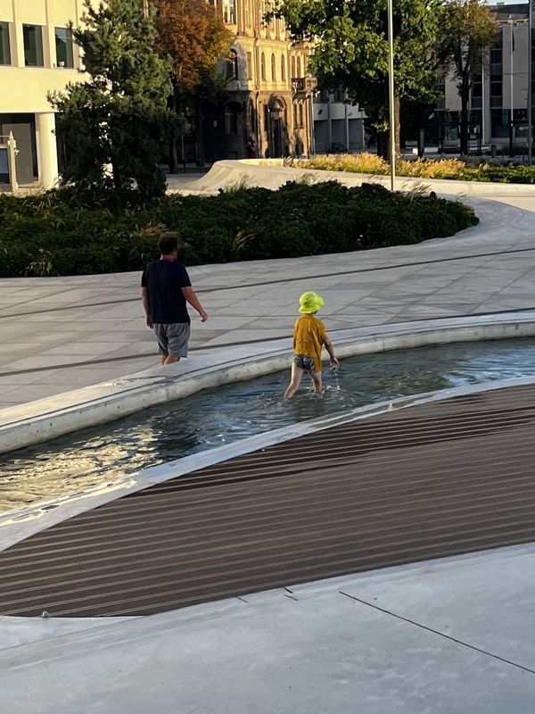 Primename, kad šią savaitę portalo kauno.diena.lt skaitytoja Klaudija pasidalijo keliomis nuotraukomis iš Vienybės aikštės. Nuotraukose matyti, kaip nuogi vaikai taškosi čia įrengtame fontane, o tėvai juos skatina ir toliau turkštis vandenyje. Negana to, tokios vaikų maudynės dažnai įamžinamos ir telefonais.