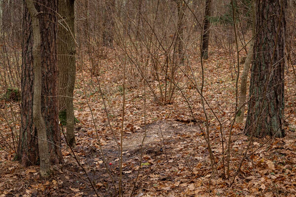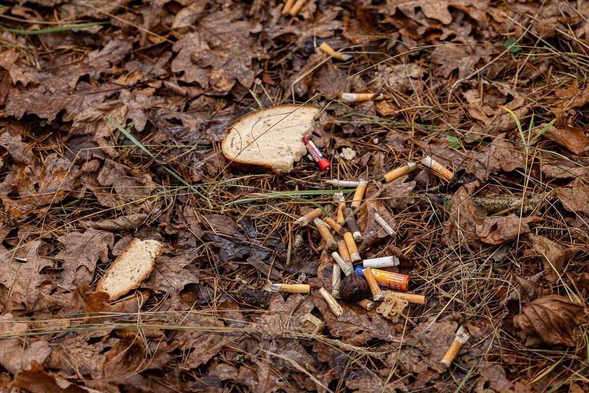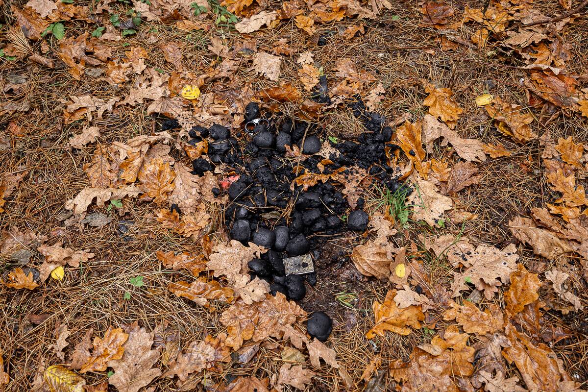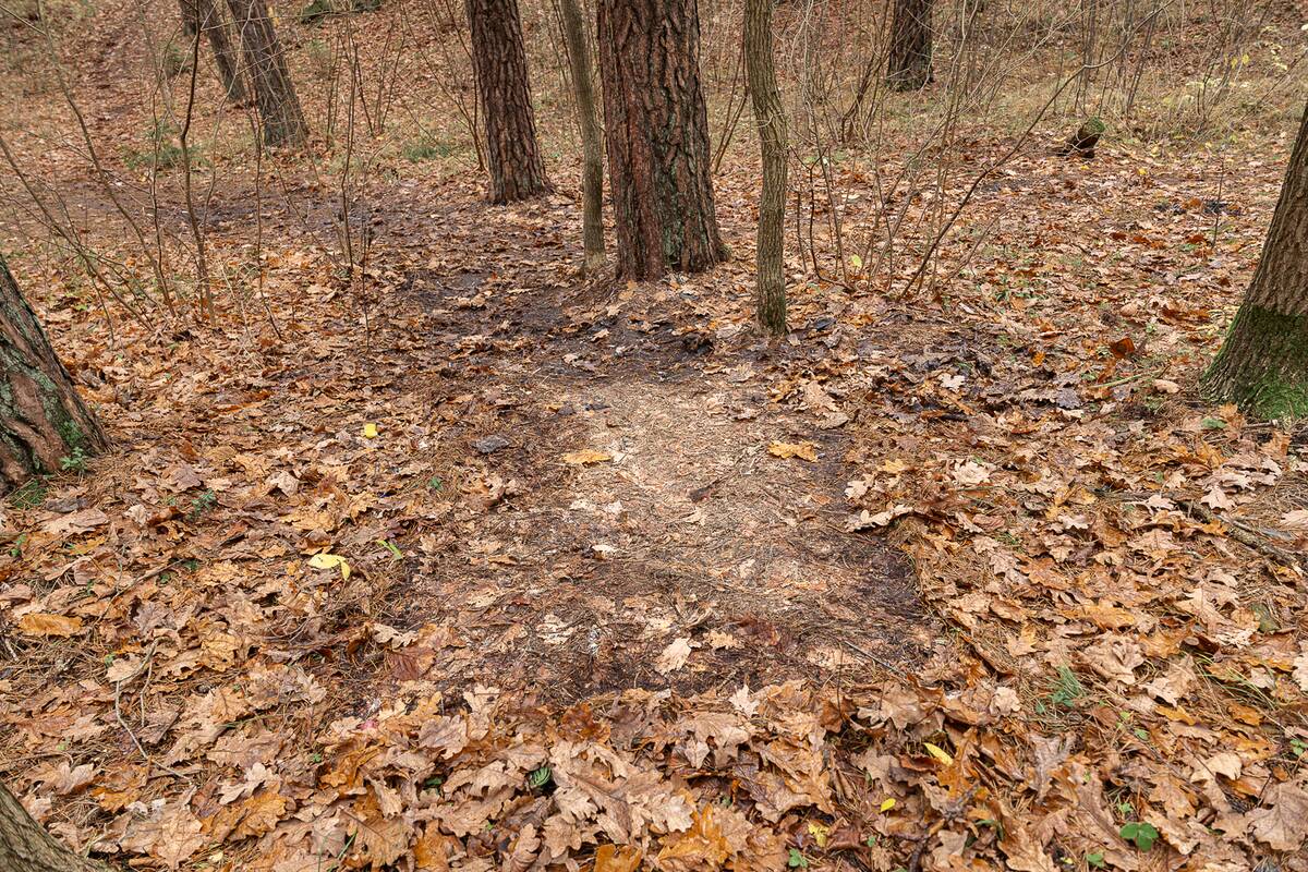 Palypėję ant kalniuko nuo jo pamatėme nugulėtą miško paklotės plotelį. Ten tikriausiai ir stovėjo palapinė. Aplink mėtėsi baterijos, išorinė baterija, atminties kortelė. Netoliese – laužavietė.