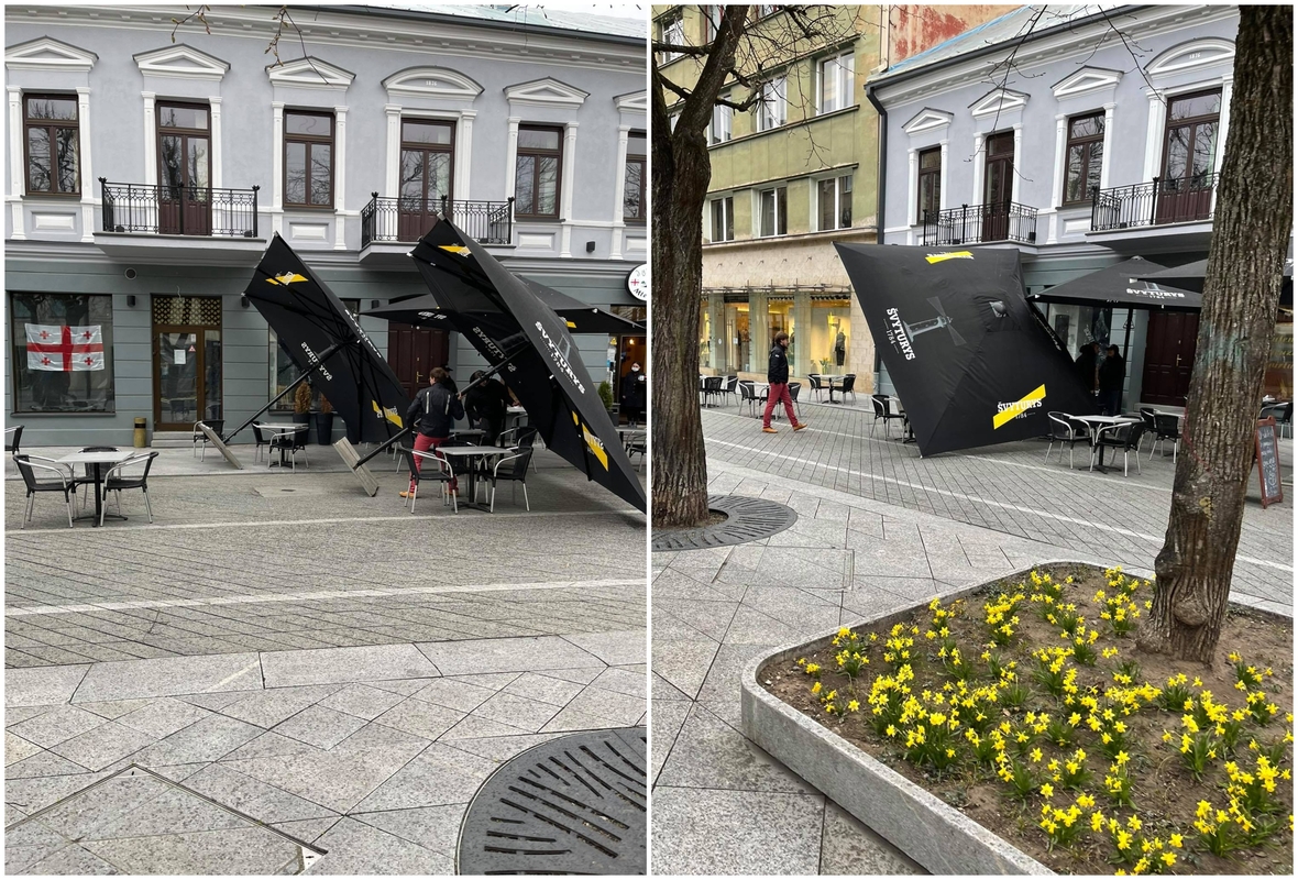 „Vaikščiodami po miestą išgirdome netikėtą garsą, pamatėme, kad kavinės skėčiai pradėjo kristi kaip lapai. Išsigandome, kad nebūtų užvirtę ant maitinimo įstaigoje buvusių klientų. Keista, kad sušvelninus karantiną, kavinės savininkai nepasirūpino tinkamomis sąlygomis bei saugiai nepritvirtino skėčių, juk taip – tik per plauką nuo skaudžios nelaimės“, – nerimą išsakė vyras.