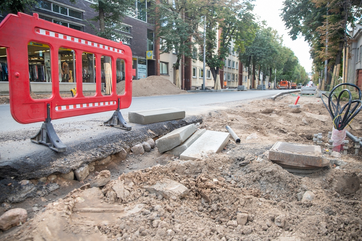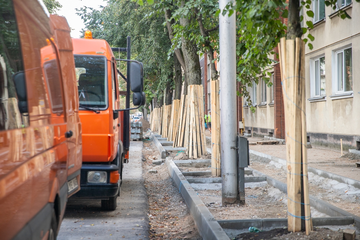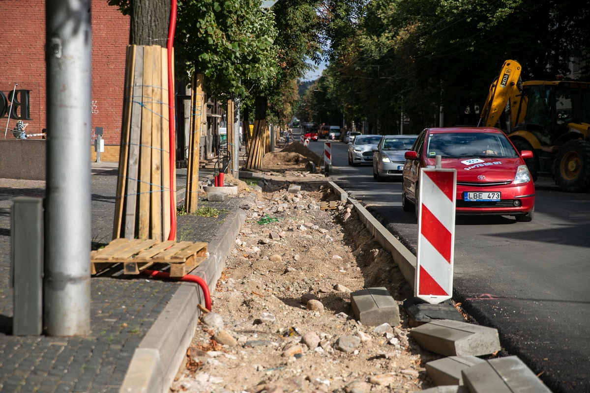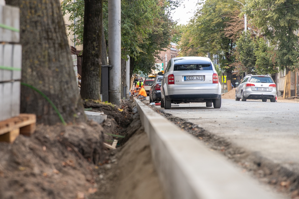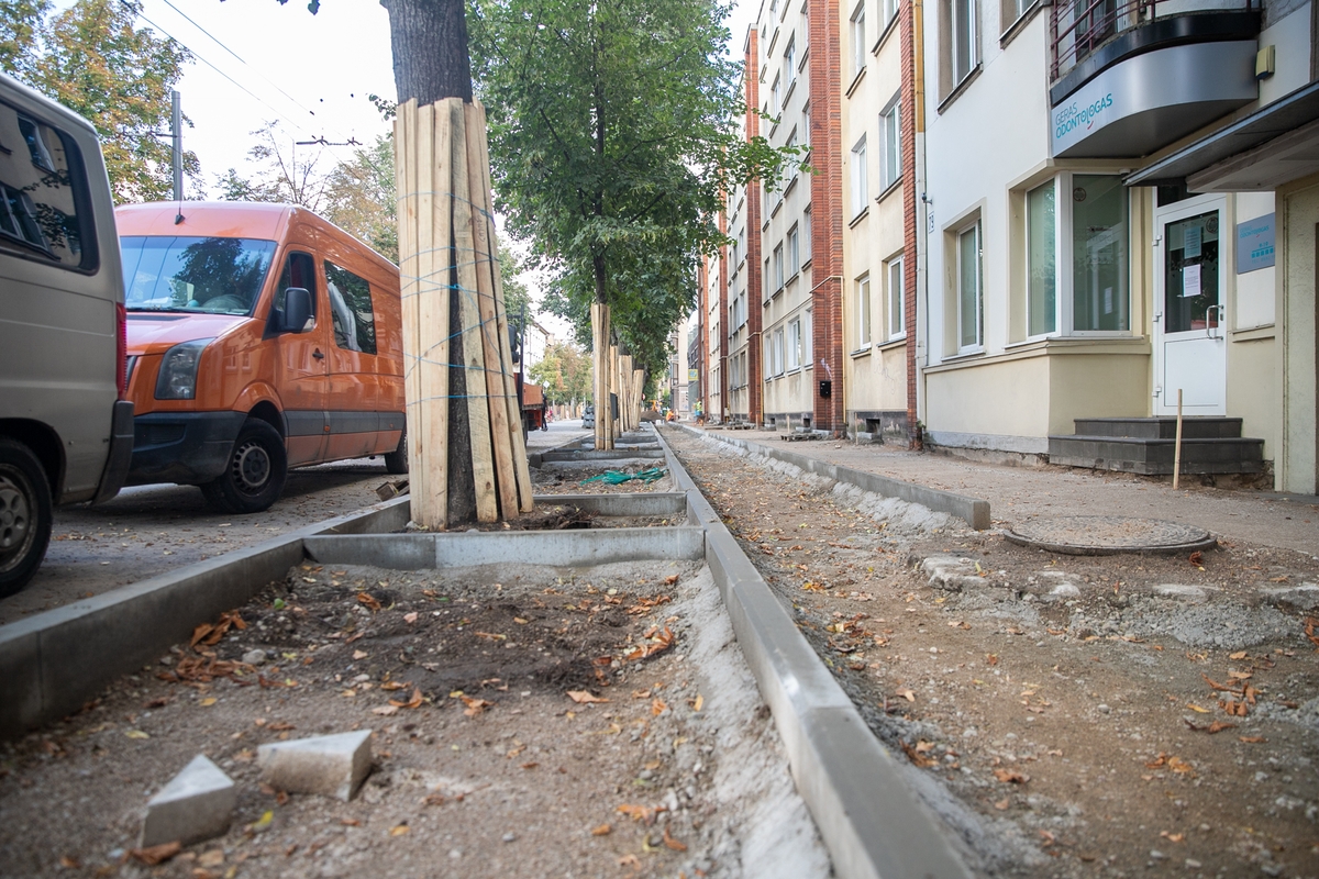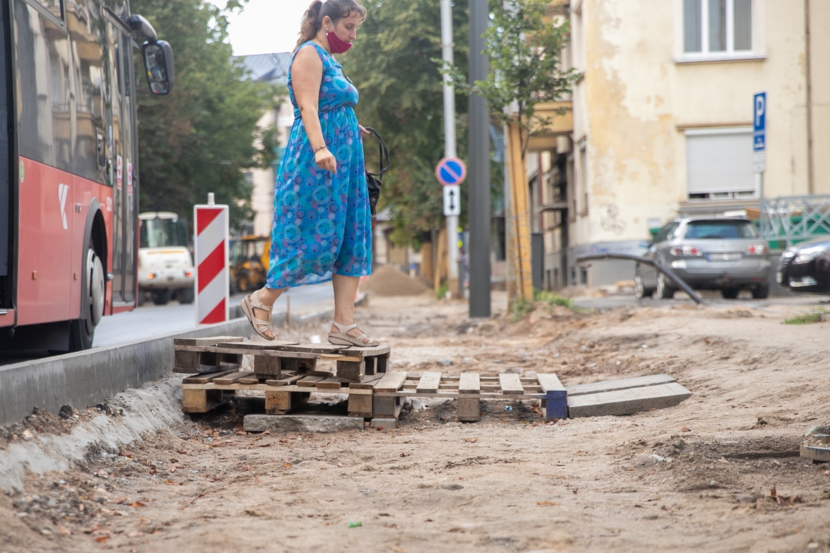Pasak jos, pereiti remontuojamą Kęstučio g. dabar – tikras iššūkis. Visur sumontuoti ypač aukšti važiuojamąją kelio dalį nuo šaligatvio skiriantys bortai, kuriuos perlipus atsiduriama tarsi smėlio duobėje, nes kol kas čia neišklota jokia danga.