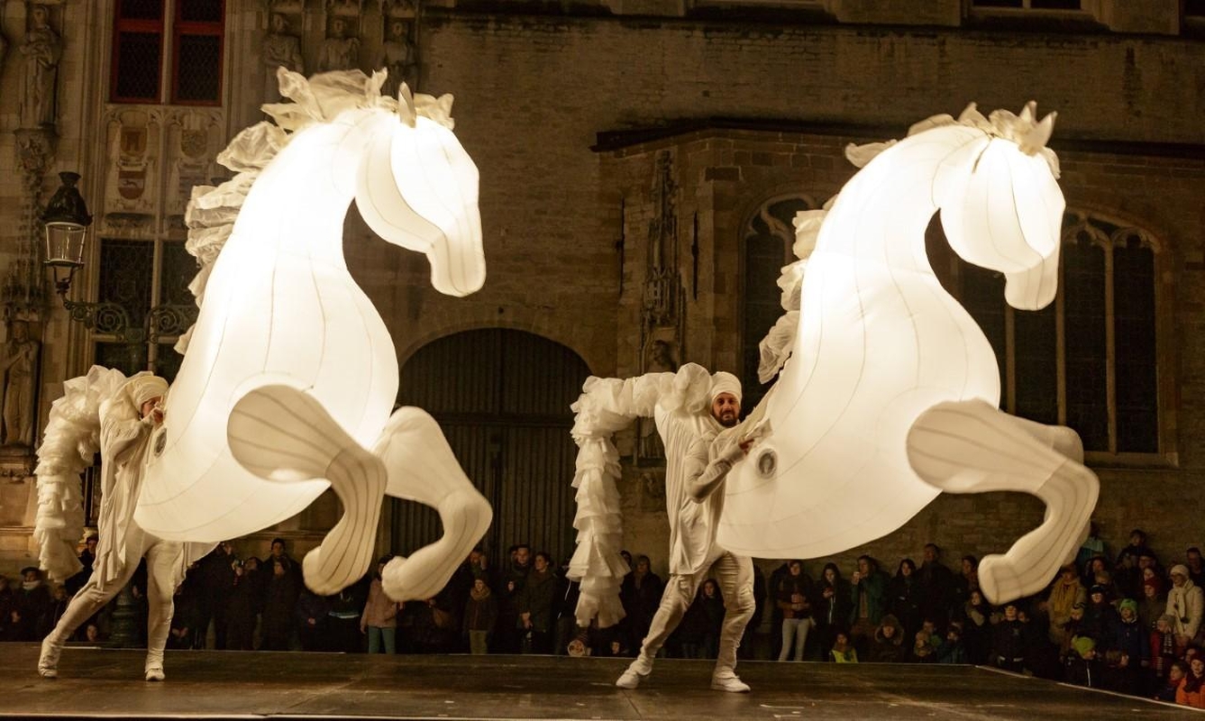 Prancūzų pabalnoti, 4 m aukščio žirgai, pasak šventės organizatorių, įsuks didžiąją eglę-karuselę, taip tarsi skelbdami miestą įtrauksiančių linksmybių pradžią. Netrukus po šio šou susirinkusieji išvys keturis būgnininkus ir jų meninį performansą.